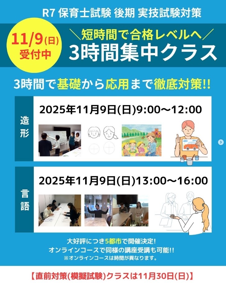 今日から11月🍄、実技試験まであと1ヶ月と1週間。 実技の練習は順調でしょうか? 合格の秘訣は、ポイントを知って効率的に練習すること。11月9日(日)5都市で講座を開催📢 遠方の方には16日(日)にオンライン講座を開催。 是非ご参加ください! x.gd/DF1iP #保育士試験 #実技試験 pic.x.com/jl7U9J04Xv