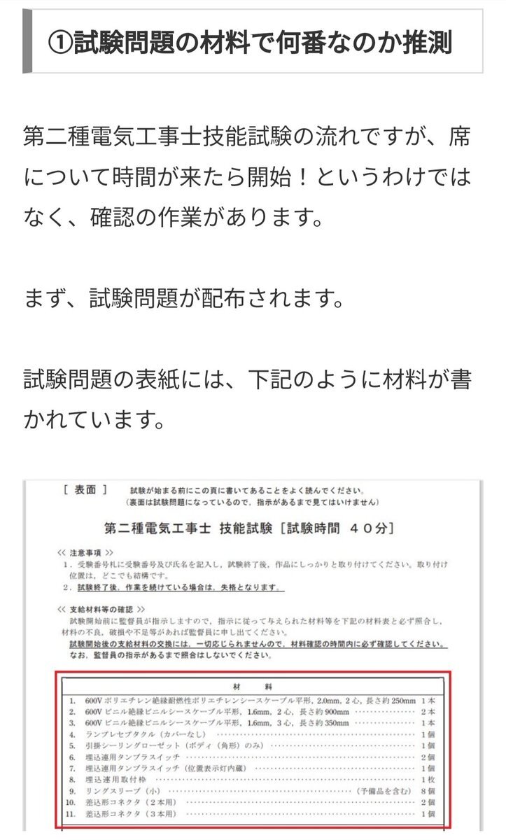 ビルメンで働いてるときに電工2種の技能対策をリアルに聞かれることが多かったので 候補問題が13パターンあり 全てのパターンを材料が載っている箇所を印刷とラミネートし、英単語の暗記カード(実際にはカードゲームのサイズ)みたいにして材料だけで「候補問題◯番」と即答できるようにしてた