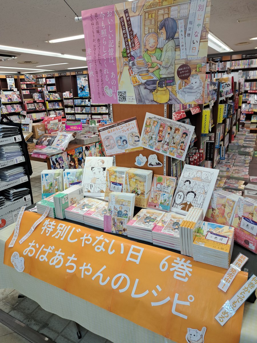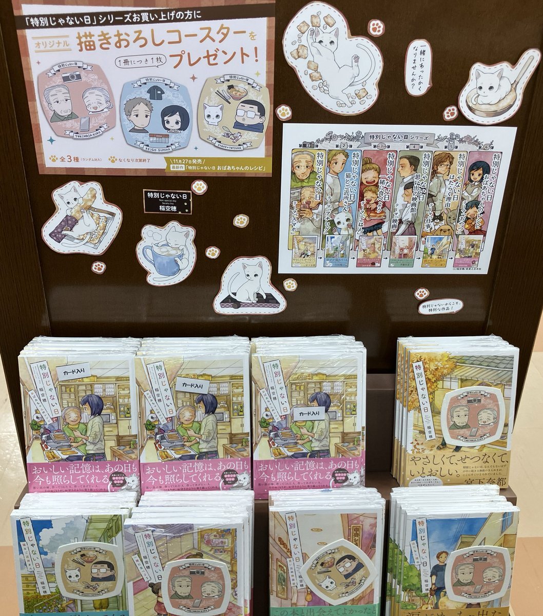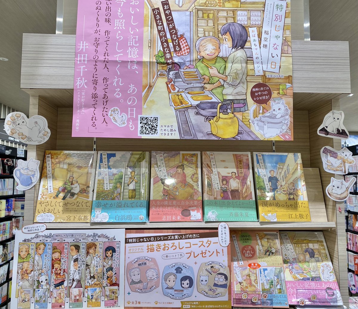 『特別じゃない日』フェア開催中です! ただいまご購入の方に特典コースターをプレゼント❤(ランダムで1枚封入済みです!)最新6巻は心温まる「おばあちゃんのレシピ」😸あなただけの“特別じゃない日”を見つけてみてくださいね🥰 #稲空穂 #実業之日本社 #特別じゃない日ディスプレイコンテスト pic.x.com/Y2Xz1go2Ta