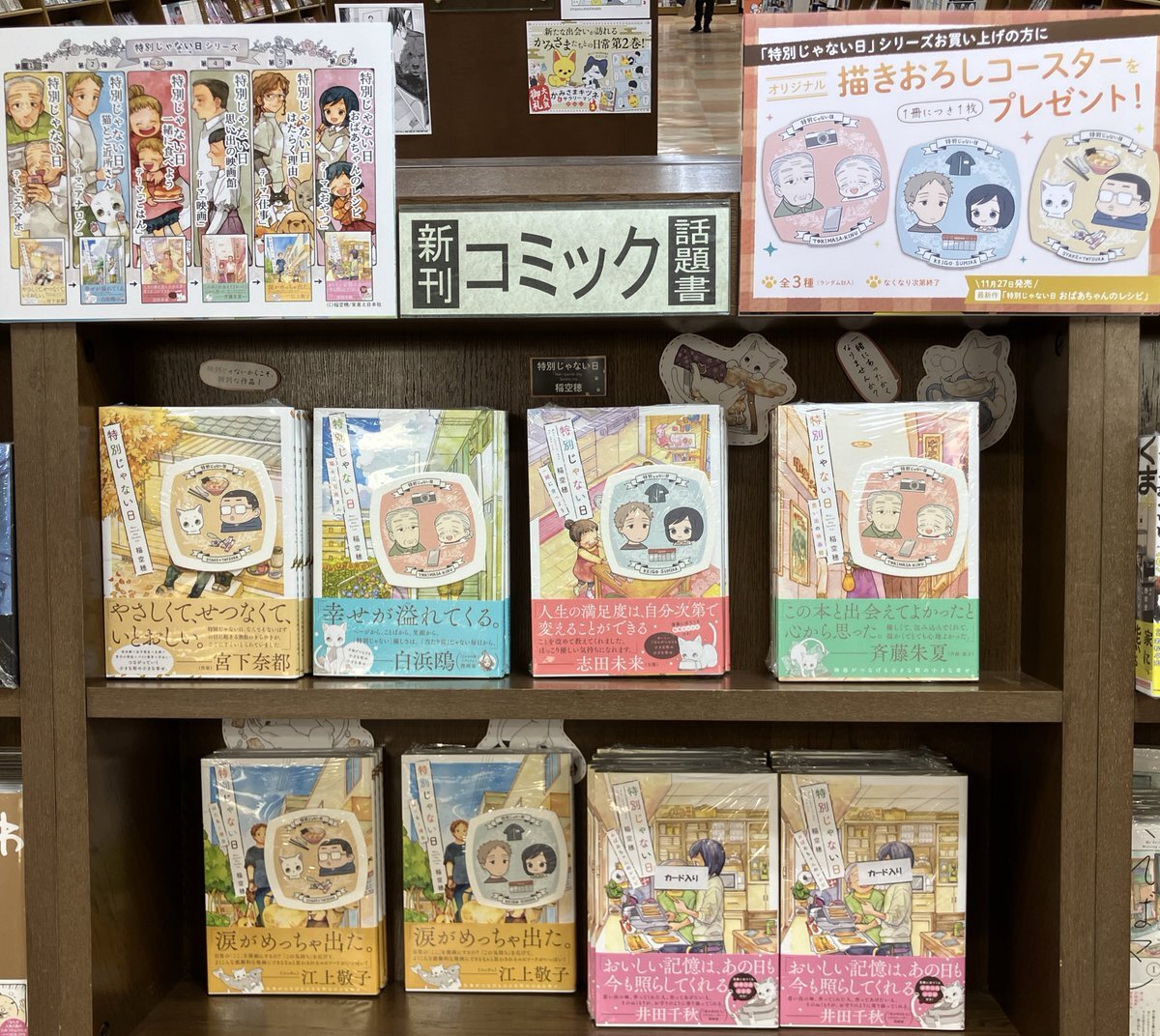 📚4階コミックコーナー 本日「特別じゃない日 おばあちゃんのレシピ」が入荷致しました 新刊には店舗限定特典のポストカードが封入しております。既刊にはコースターが封入済みです それぞれなくなり次第終了となりますのでご了承くださいませ #実業之日本社 #特別じゃない日ディスプレイコンテスト pic.x.com/ZDnWU5vj5z