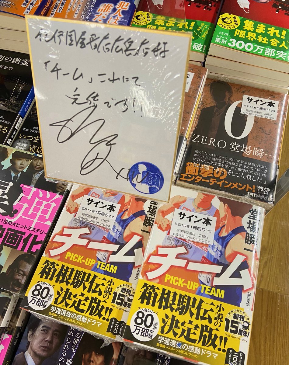 本日 堂場瞬一さんにお越しいただきました✨ ランナー達の葛藤と激走を描ききったスポーツ小説の金字塔 「チ-ム」が新装版となって登場。 新たなあとがきも収録されています。 サイン本を作成いただきましたので、ぜひお早めに! #堂場瞬一 #実業之日本社 pic.x.com/vORZk6CUu9
