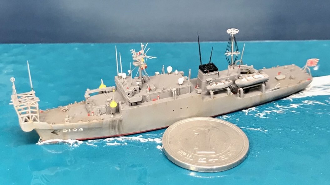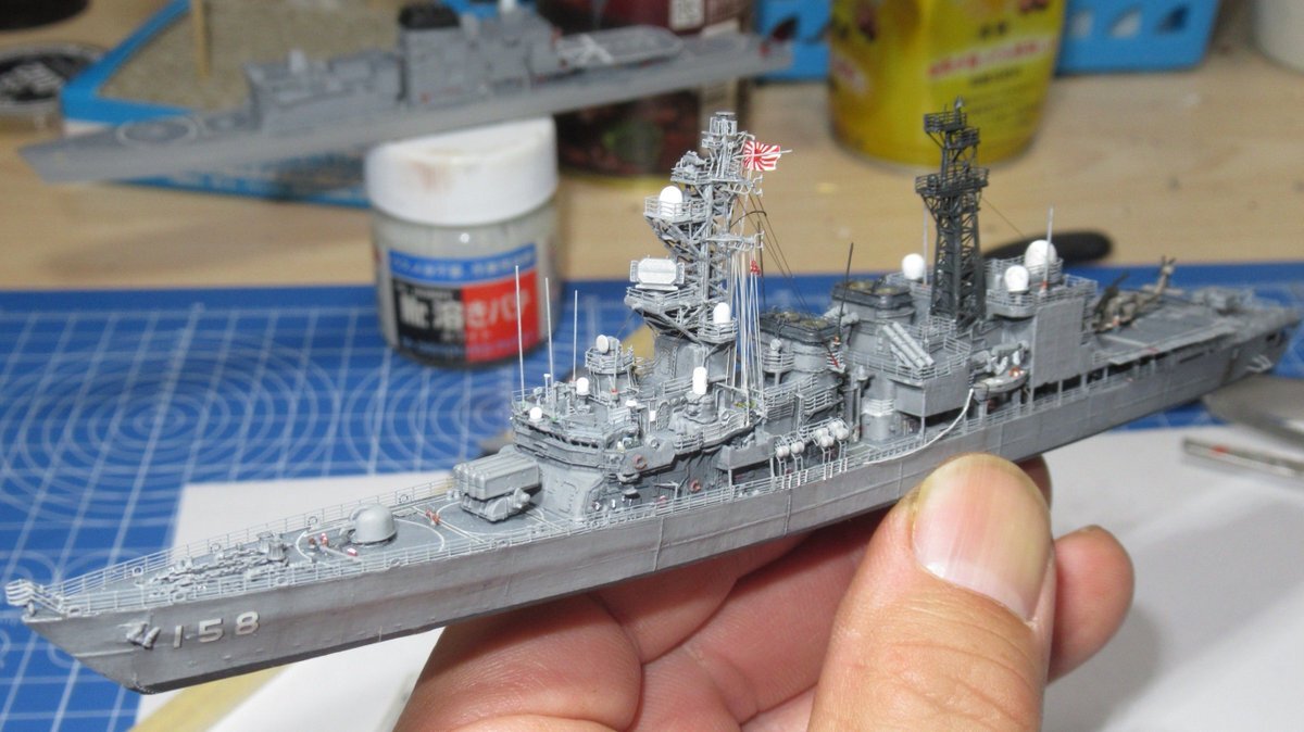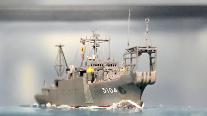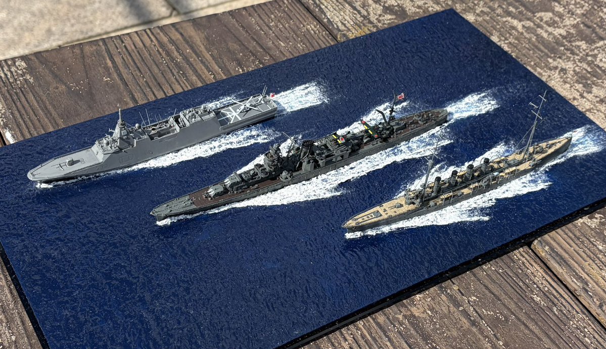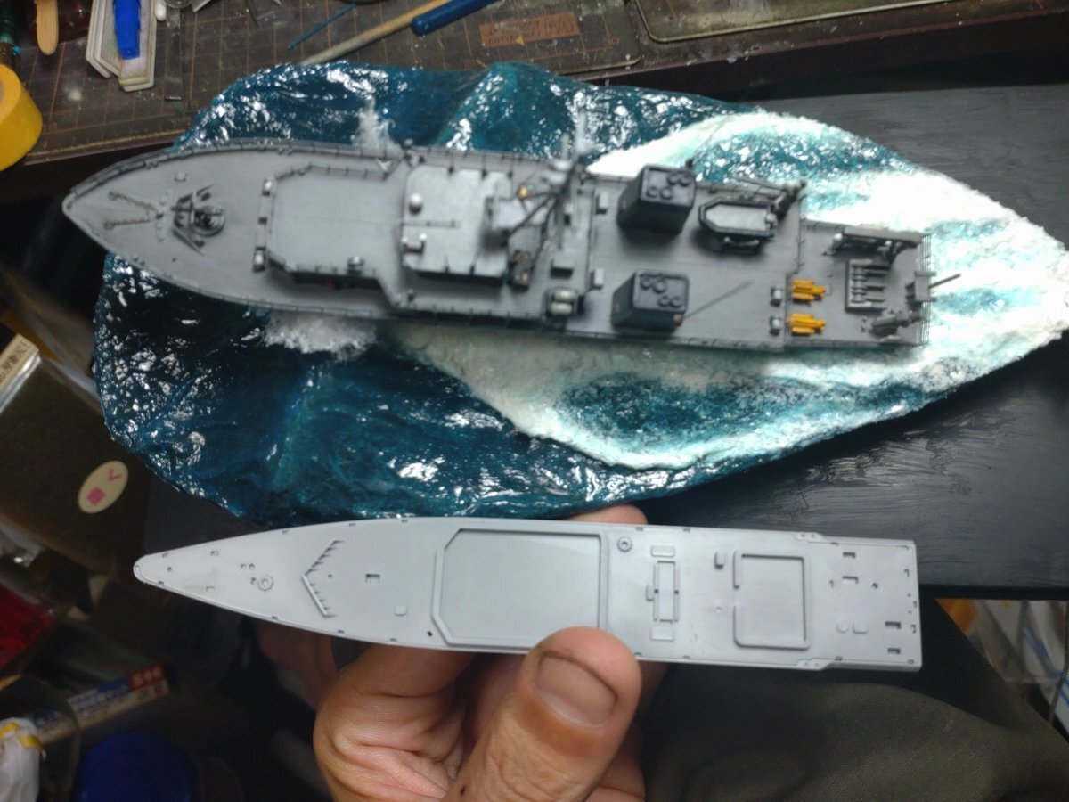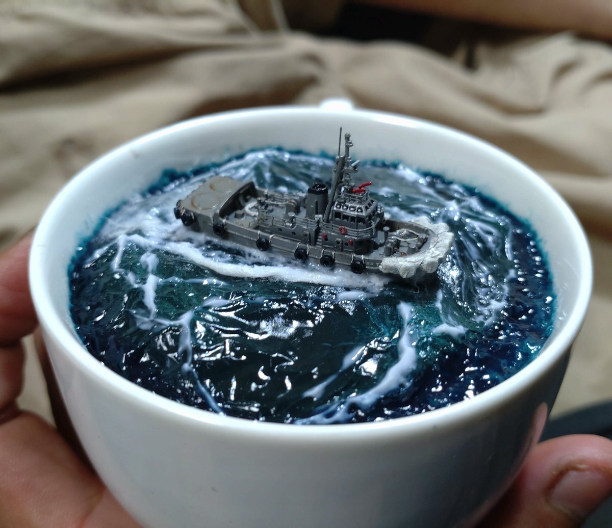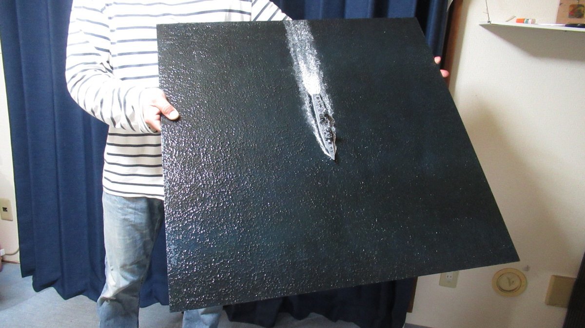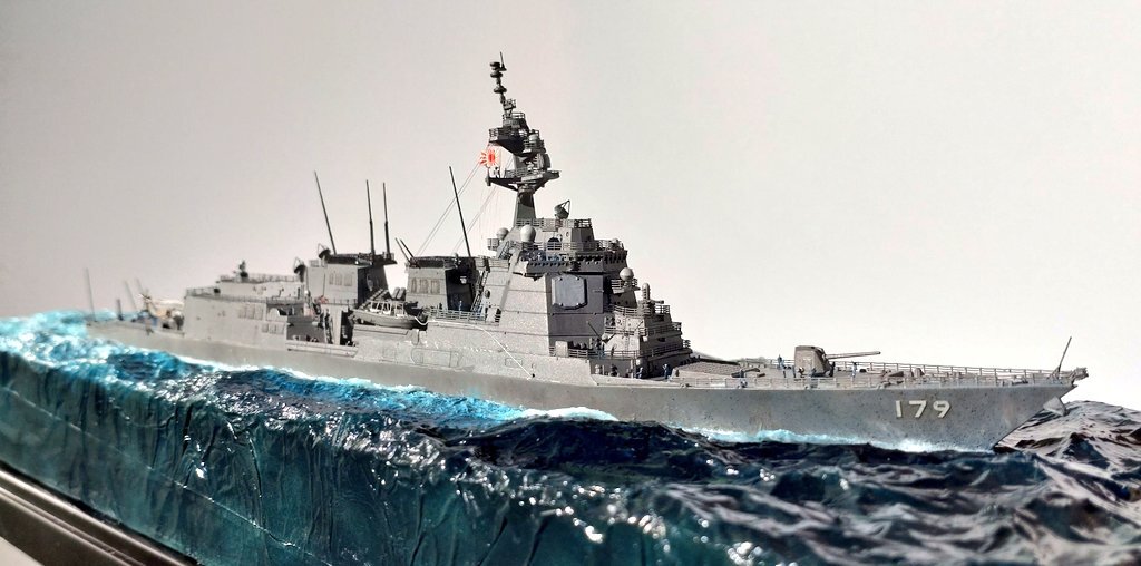 #実物のサイズが気になる いつも投稿している 1/700 艦船模型洋上ジオラマ作品の正体です 写真はピットロード1/700 護衛艦うみぎりです。 艦は手のひらサイズですが海はこんな感じです。 艦と海は別々に保管し海は専用のダンボールに包み紫外線と埃対策としています。 pic.x.com/wZ4QhDGeSe