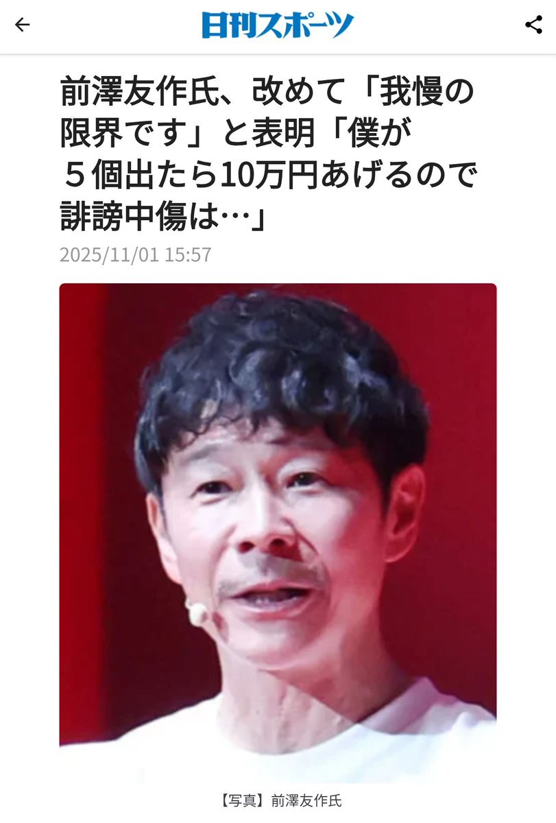 "前澤友作氏、改めて「我慢の限界です」と表明「僕が5個出たら10万円あげるので誹謗中傷は…」" l.smartnews.com/m-6vareQMw/elp…❇️ #我慢の限界 #前澤友作氏 #宣言 #表明 😣😣😣 threads.com/@ziyonsukeakur…❇️ Instagram.com/ziyonsukeakurou❇️ #ジョン🚬 #チャック🕶️ 🇯🇵🎌🗾 🤟🤙🤞 pic.x.com/Ahba7kmaww