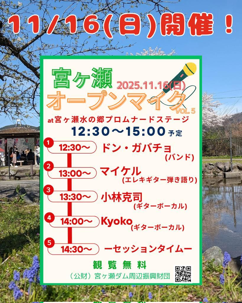 🎤宮ヶ瀬オープンマイクvol.5🎤 紅葉🍁も見頃となった宮ヶ瀬です。 11/16(日)はお馴染みとなったイベント『宮ヶ瀬オープンマイクvol.5』実施予定です☀️ 出演者が決定しました! 宮ヶ瀬で楽しむ音楽、湖畔園地の景色、水の郷商店街グルメを頬張りながら1日堪能しませんか😆 #宮ヶ瀬 #オープンマイク pic.x.com/CR8irChL5R