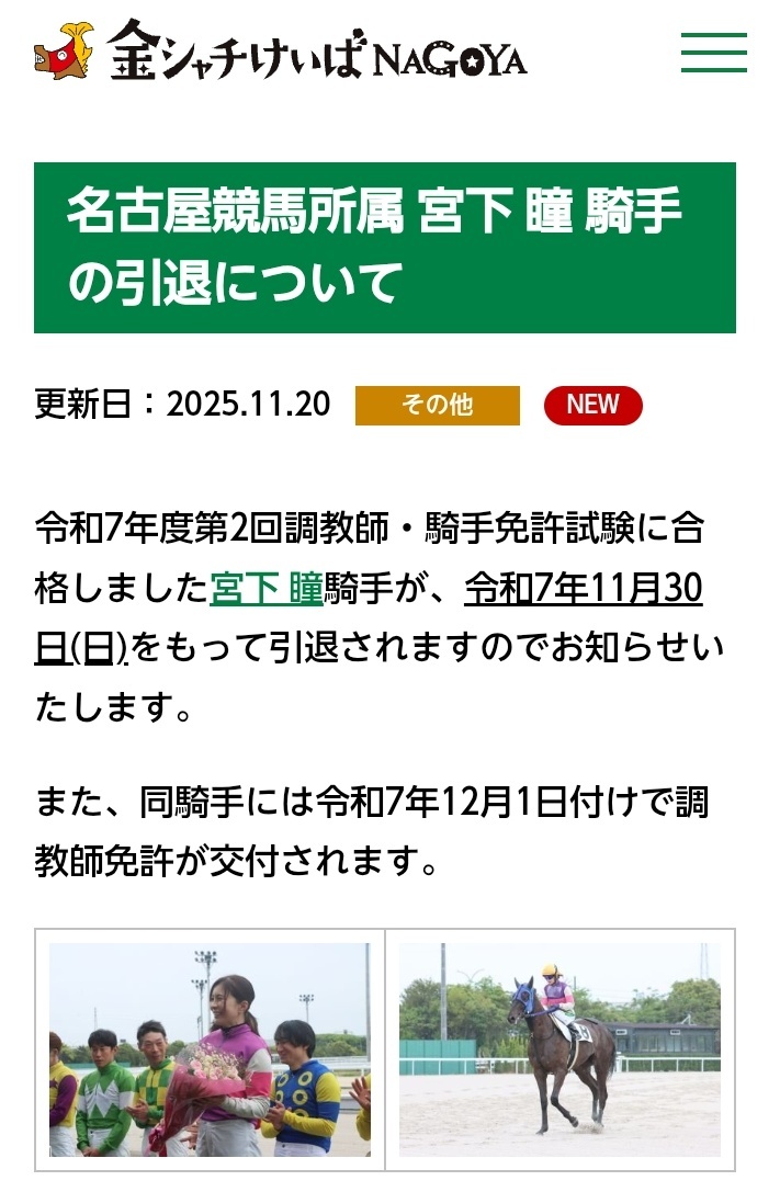 【宮下 瞳騎手引退セレモニー🌸】 令和7年11月26日(水)、第6レース終了後(17:30頃)、宮下騎手の多年にわたる功績を称え、引退記念セレモニーを名古屋競馬場ウィナーズサークルにおいて実施します。 詳しくはこちら↓↓↓ nagoyakeiba.com/news/2025/11/p…