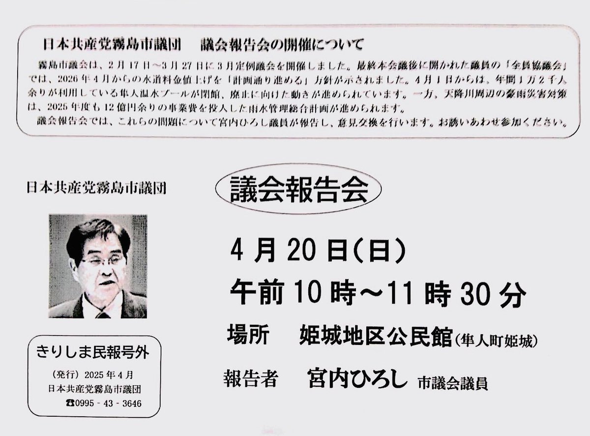 こんばんは! 明日は霧島市議団の #宮内ひろし 議員が市政報告会を行います。 霧島市では、物価高で生活が苦しいなか水道料金の大幅値上げを進めています。 また一方的な隼人温水プールの閉鎖、豪雨災害対策、安心してかかれる介護保険のこと等が報告される予定です。 #日本共産党 #姶良地区委員会 pic.x.com/3pRGCCxaIL
