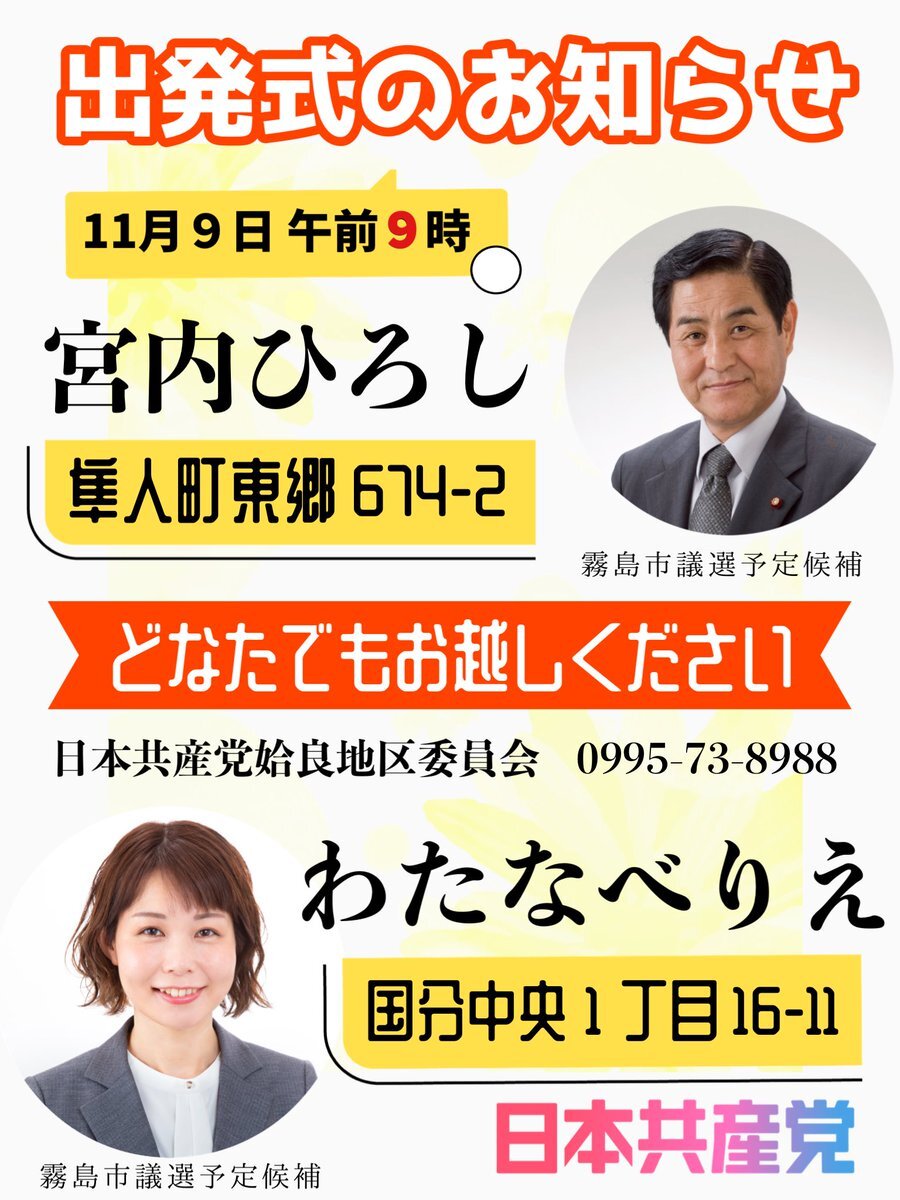 姶良地区委員会です。 いよいよ明日は #霧島市議会議員選挙 の告示日となりました。 #宮内ひろし 予定候補、#わたなべりえ 予定候補、それぞれの事務所にて出発式を行います。 明日の街頭宣伝には #田村貴昭 衆議院議員も応援に駆けつけます! ぜひ皆さんの応援をお待ちしています。 #日本共産党 pic.x.com/8y2avlcYiv