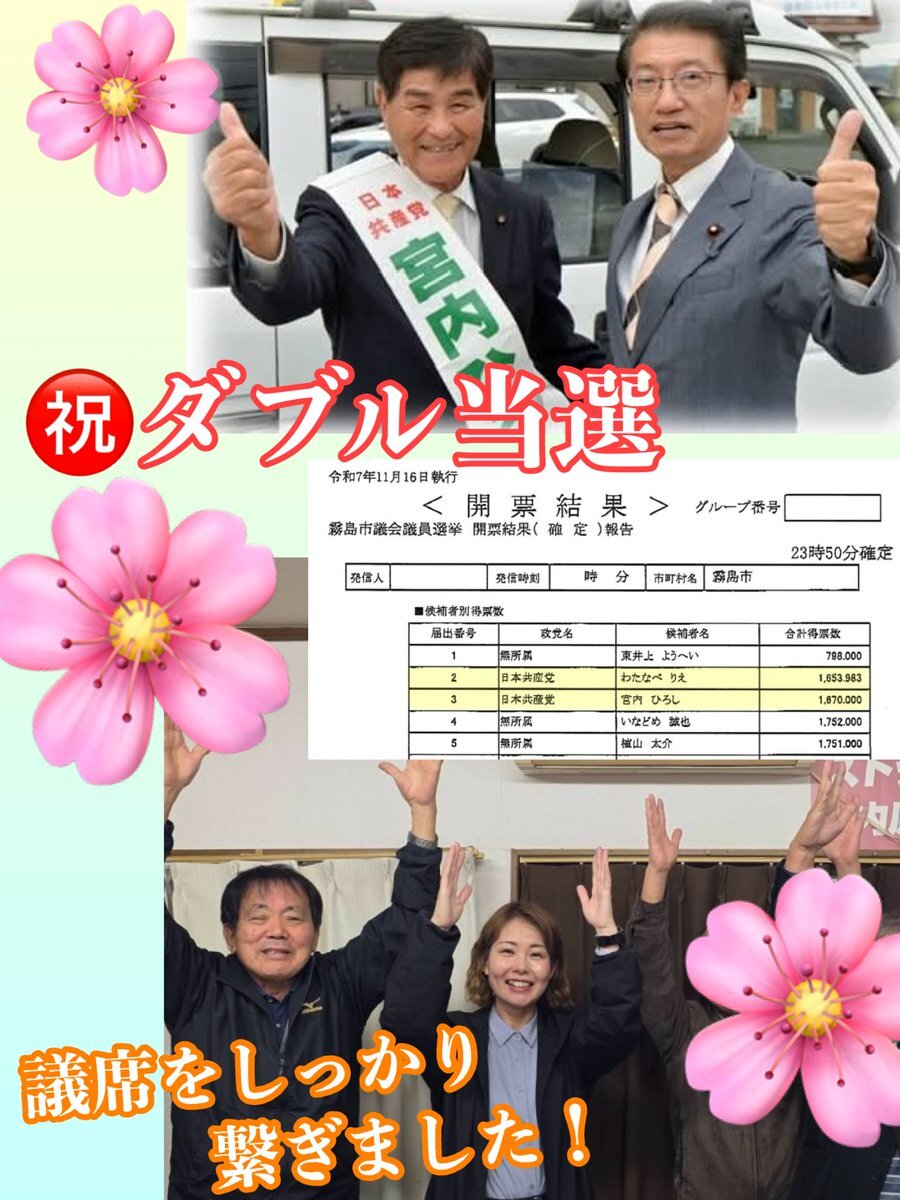 🟡鹿児島県 #霧島市議選 #宮内ひろし #わたなべりえ お二人当選!🎊🎊🎊 おめでとうございます👏✨👏 霧島市議会議員選挙 - 2025年11月16日投票 | 鹿児島県霧島市 | 選挙ドットコム share.google/COu5dVQhrkFYgq…