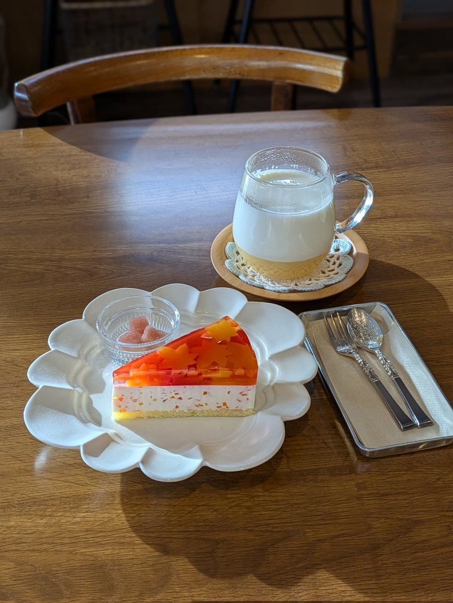 今年98店目はCafeこもれび(仙台太白区) もみじのレアチーズケーキとラ・フランスミルク、こもれびブレンド(深緑)を ケーキ、色味がきれい✨ 柑橘の味が爽やかで、おいしい🍁 ラ・フランスミルクは香りよし 味も甘みがあってまろやかな牛乳と合う❗️ ぼーっとまったりした時間☺️ #宮城カフェ #カフェ巡り pic.x.com/hZUhmGjxqo