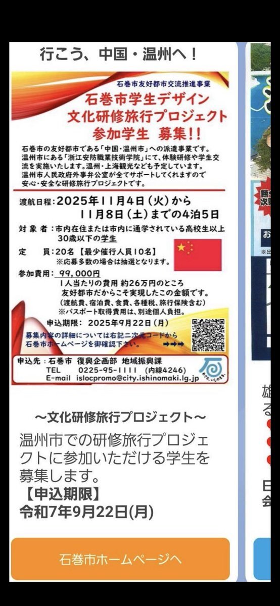 返信先:@swim_shu1宮城県石巻市でも11月に 文化研修旅行をするそうです。 石巻市は、過去数回互いの国の学生が行き来して研修をしているようです。 だがこの時期に、やるのは危険ではないのかな。 #宮城県石巻市 #文化研修旅行 pic.x.com/rLGfQgAyrt