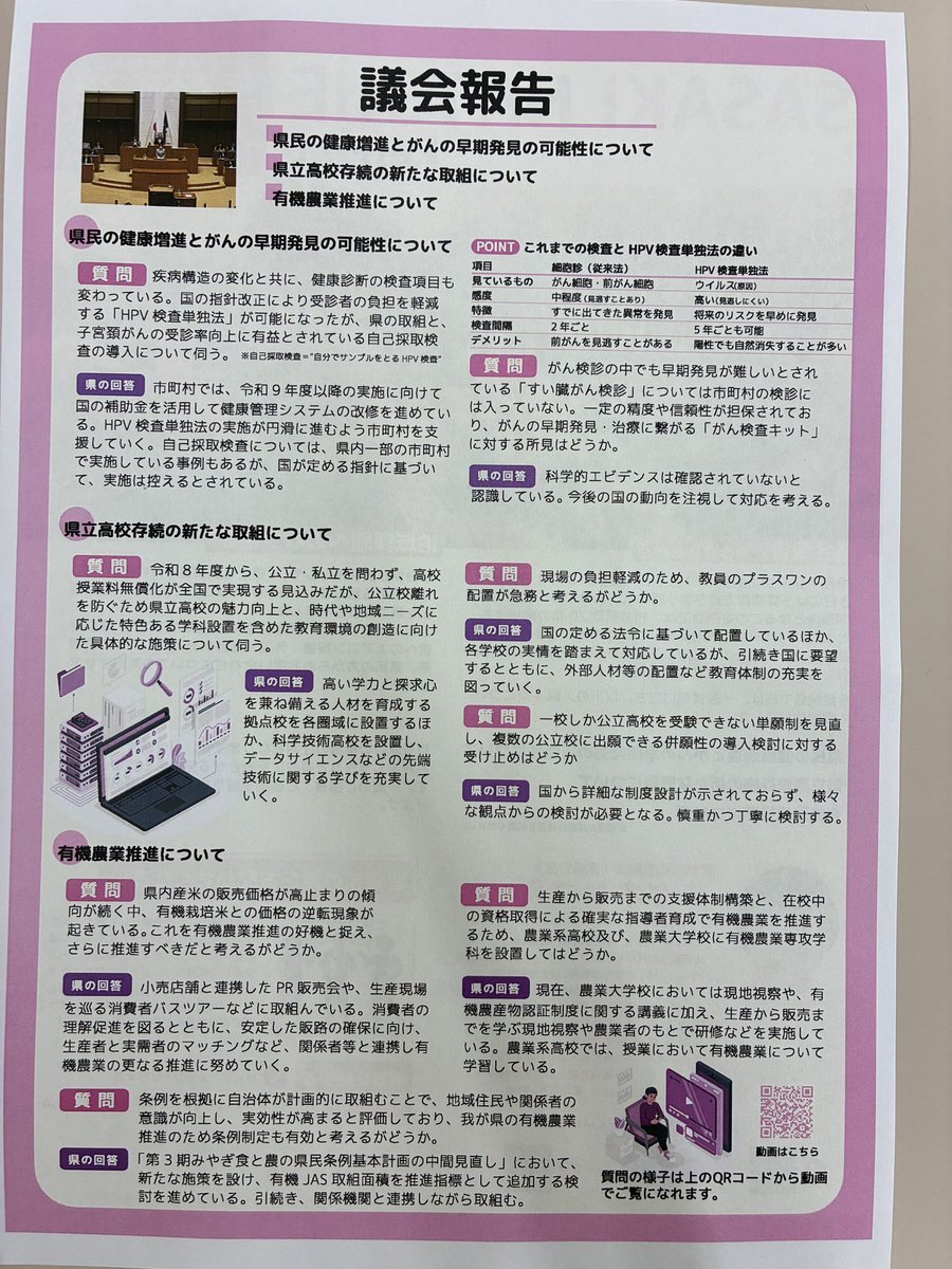 【宮城県議会一般質問が終わりました】 大綱3点について質問させていただきました。 1.県民の健康増進とがんの早期発見の可能性について 2.県立高校存続の新たな取組について 3.有機農業の推進について 詳細は、県政報告書にてお知らせ致します。 #佐々木なつえ #宮城県議会議員 #宮城野区 pic.x.com/5ueyPB6bFR