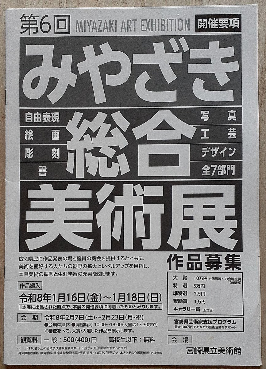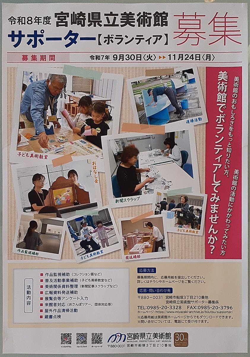 #宮崎県立美術館 を勝手に応援と宣伝 ①サポーター募集 ボランティアなんですが、義務感ゆるくて、たまに美術展の招待状を貰えます😅 美術展チラシの発送準備、作品監視補助、屋外彫刻の清掃など ②総合美術展の作品募集 宮日総合美術展の時代と合わせると70年以上の歴史ある公募展です pic.x.com/rD0a93RsVG