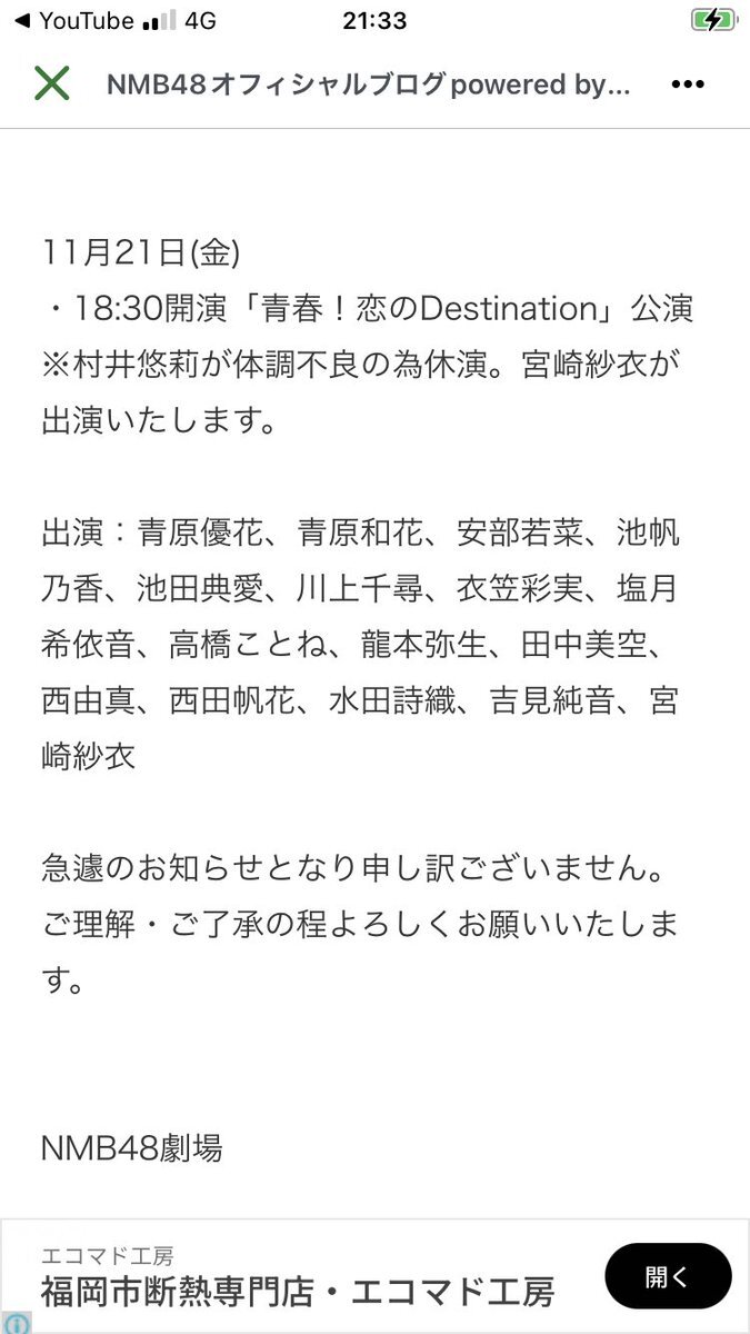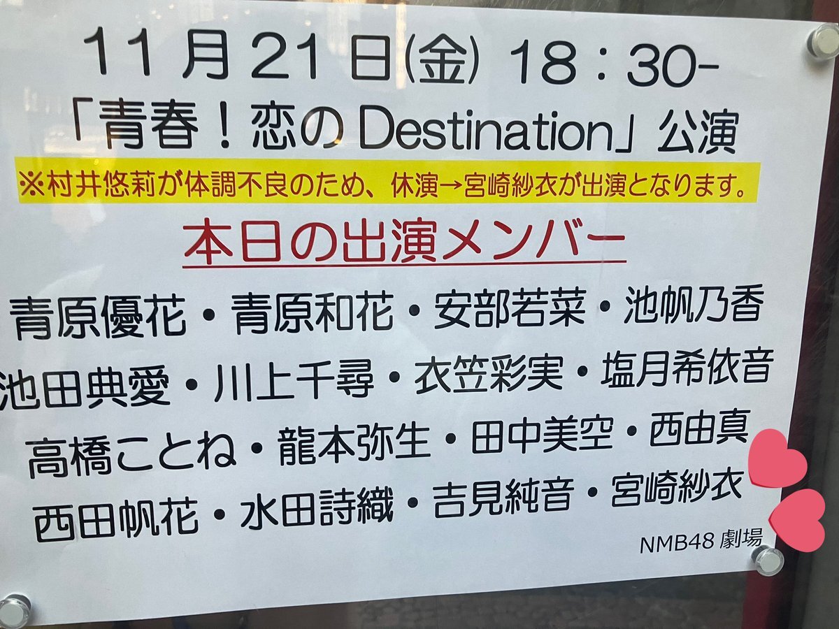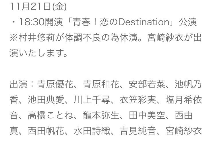 『11月21日公演 出演メンバー変更のお知らせ』 #村井悠莉 さんが体調不良の為休演 #宮崎紗衣 さんが出演いたします さえぽん初日頑張って下さい! ゆうりちゃんお大事になさって下さい ameblo.jp/nmb48/entry-12…