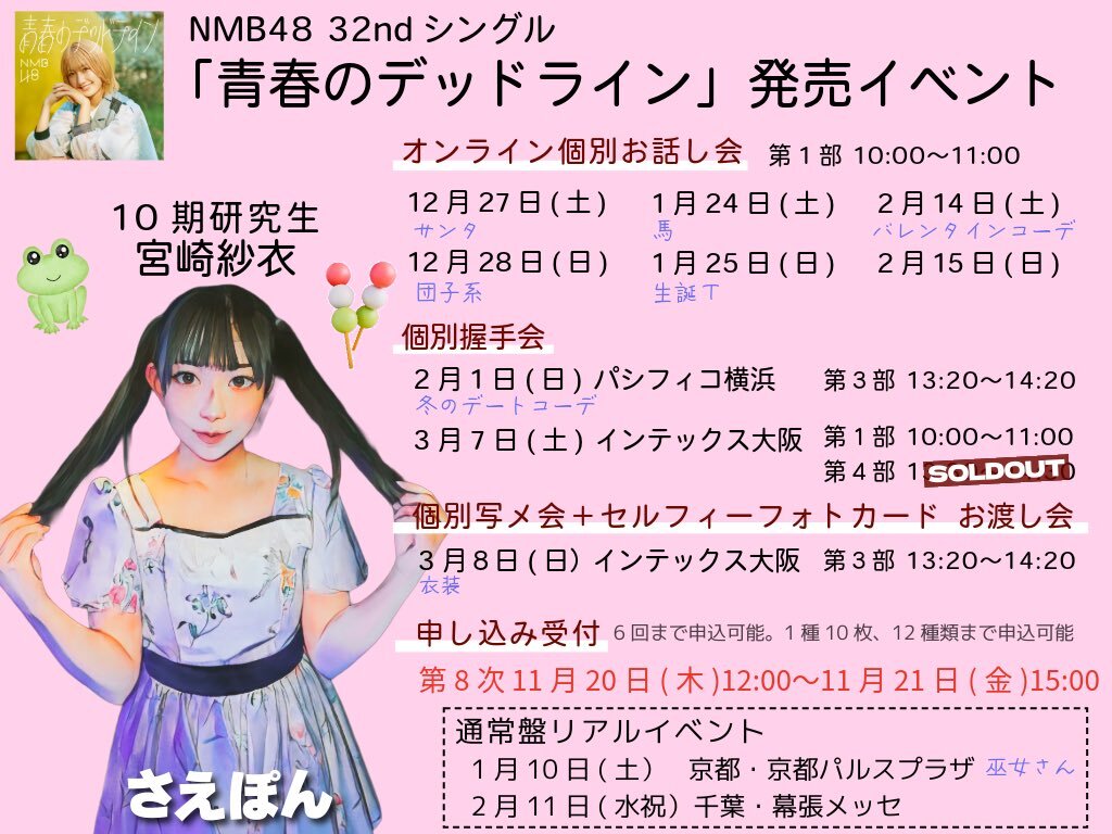 #NMB48 32ndシングル 「#青春のデッドライン」劇場盤💿 《申し込み期間》 第8次 11月20日(木)12:00〜11月21日(金)15:00 🔽申し込み store-annex.universal-music.co.jp/event-list/nmb… #宮崎紗衣@nmb48_miyazaki#さえぽん #NMB48_10期生 pic.x.com/Br2X2l3W7r