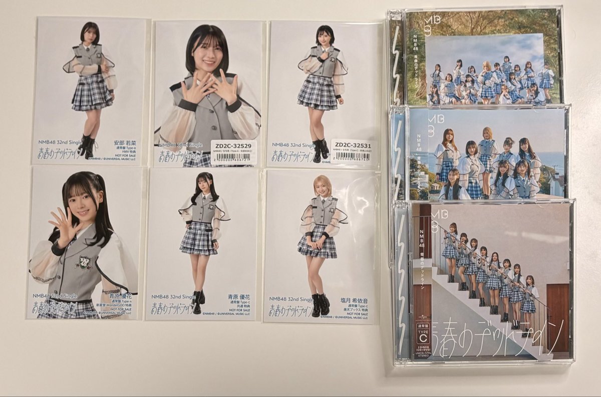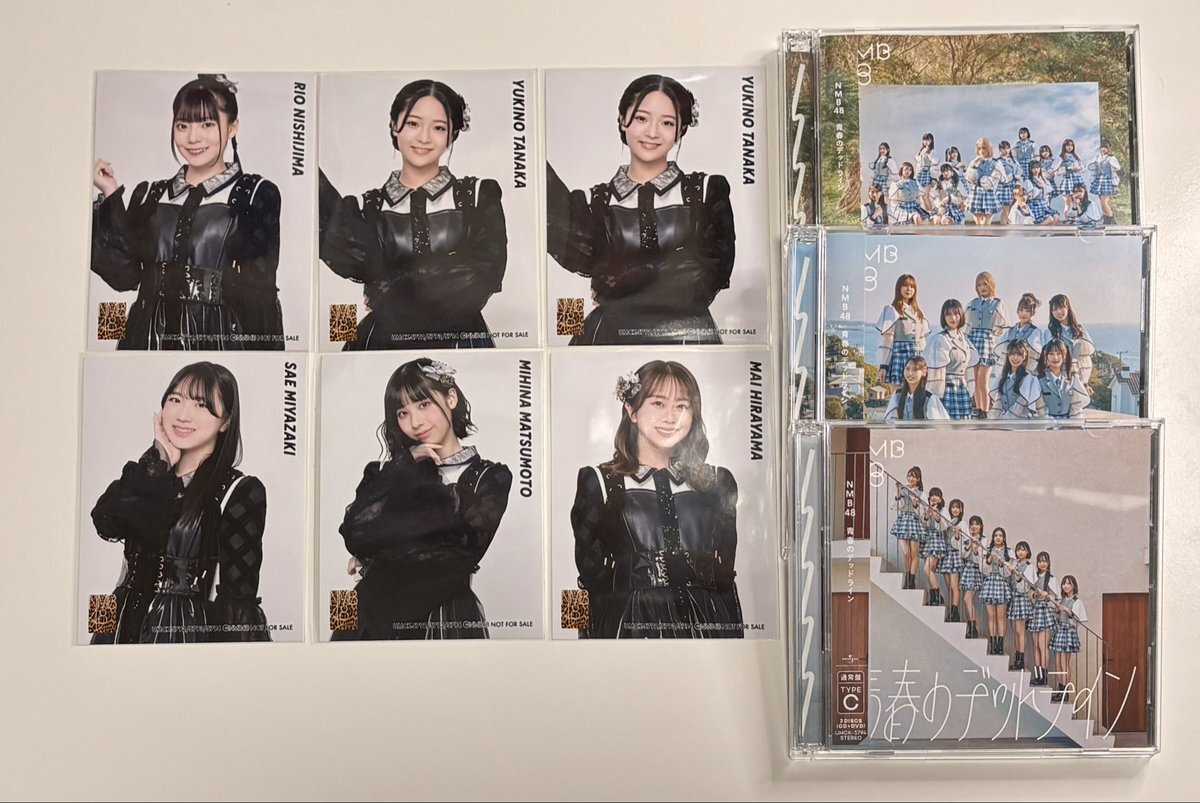 NMB48 32枚目シングル #青春のデッドライン をゲットしたので早速開封しました✨✨ 抽選は一つだけ当選‼️しました。 入ってた写真はこんな感じ🥰 #NMB48 #安部若菜 #青原優花 #高橋ことね #塩月希依音 #西島梨央 #田中雪乃 #平山真衣 #宮崎紗衣 pic.x.com/EsYcfbZjbk