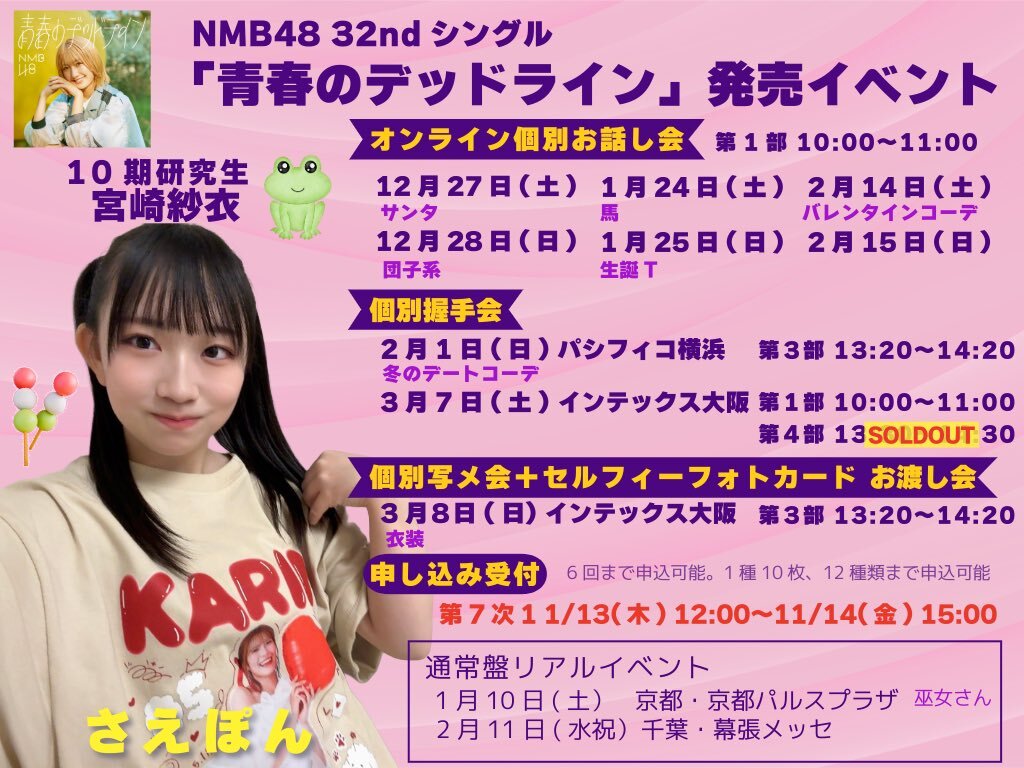 #NMB48 32ndシングル 「#青春のデッドライン」劇場盤💿 《申し込み期間》 第7次1 1月13日(木) 12:00〜11月14日(金) 15:00 🔽申し込み store-annex.universal-music.co.jp/event-list/nmb… #宮崎紗衣@nmb48_miyazaki#さえぽん #NMB48_10期生 pic.x.com/yPhGTOAY1d