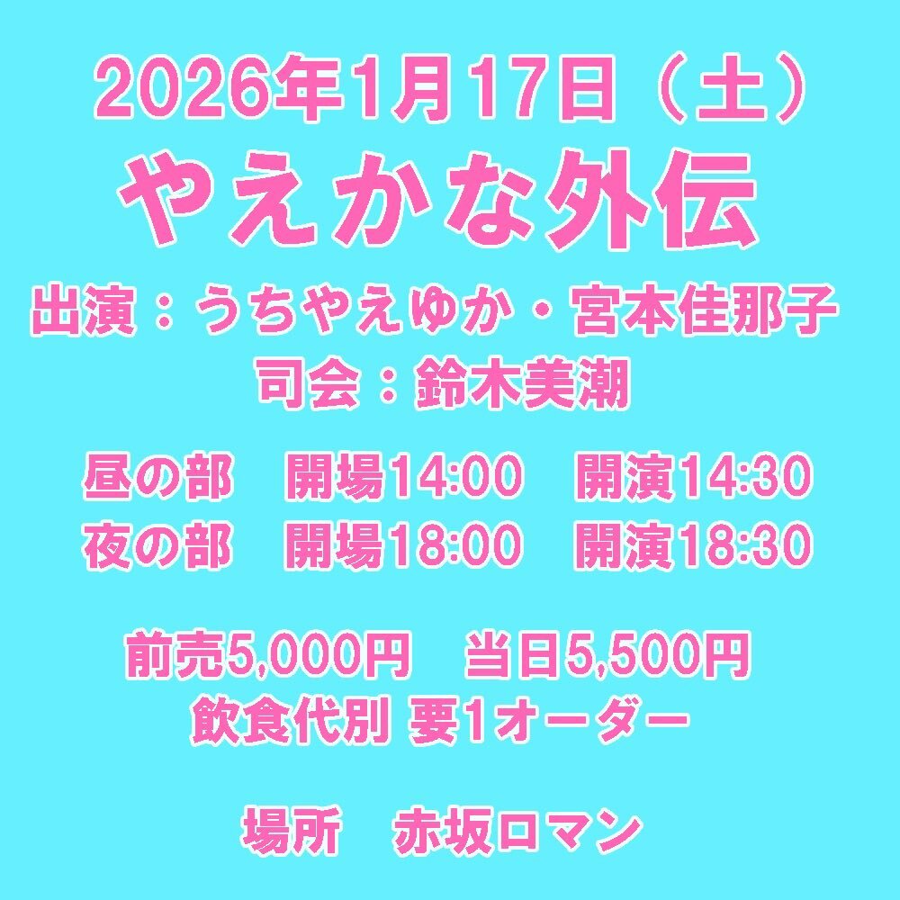 💁♀️お申込み受付中 何かやります!何か分からないけどw 一緒に笑いましょう✨ お待ちしています(⁎ᴗ͈ˬᴗ͈⁎) ⋆* 2026年1月17日(土) やえかな外伝@赤坂ロマン 昼の部14:30 夜の部18:30 出演: #うちやえゆか #宮本佳那子 司会: #鈴木美潮 🎫前売5,000円 ticketpay.jp/booking/?event… pic.x.com/OWj1tQNPei