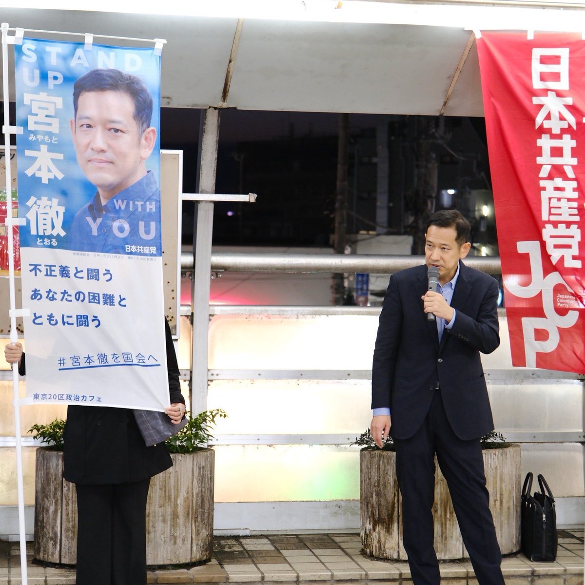 #宮本徹 前衆議院議員 と清瀬駅南口で宣伝。 #宮本徹勝手連 の幟が爽やかな空の下映えます。ありがとうございます😊 宮本さんの言葉は鋭いけど、耳の中に美しい言葉もちゃんと残る。 「議会は、国民の民意を映し出す鏡🪞」 この言葉が今日のイチ推し #議会定数削減反対  少数政党の声が反映されな