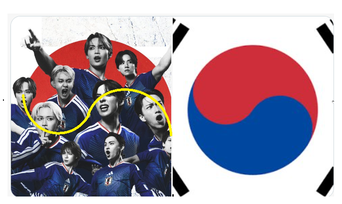 もう日本のサッカーは応援しないし見ないが、日の丸を押し潰すようにデザインされ、四隅にこの↓の旗と同じようなデザインを押し込んでいる。そして韓国人ユニットを公式のアンバサダーにする。これを偶然とは言わせないぞ。 x.com/JFA/status/198…