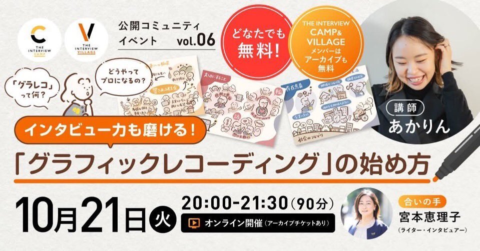 🔔どなたでも!オンライン勉強会🔔 インタビューや座談会の現場でご一緒している@suki2sunao2 あかりんさんに、グラフィックレコーディングについて聞いて学ぶオンライン勉強会を開催します!✨✒️ リアルタイムに話を聞きながら要点をつかんで構造化する技術は、インタビューにも役立つはず。