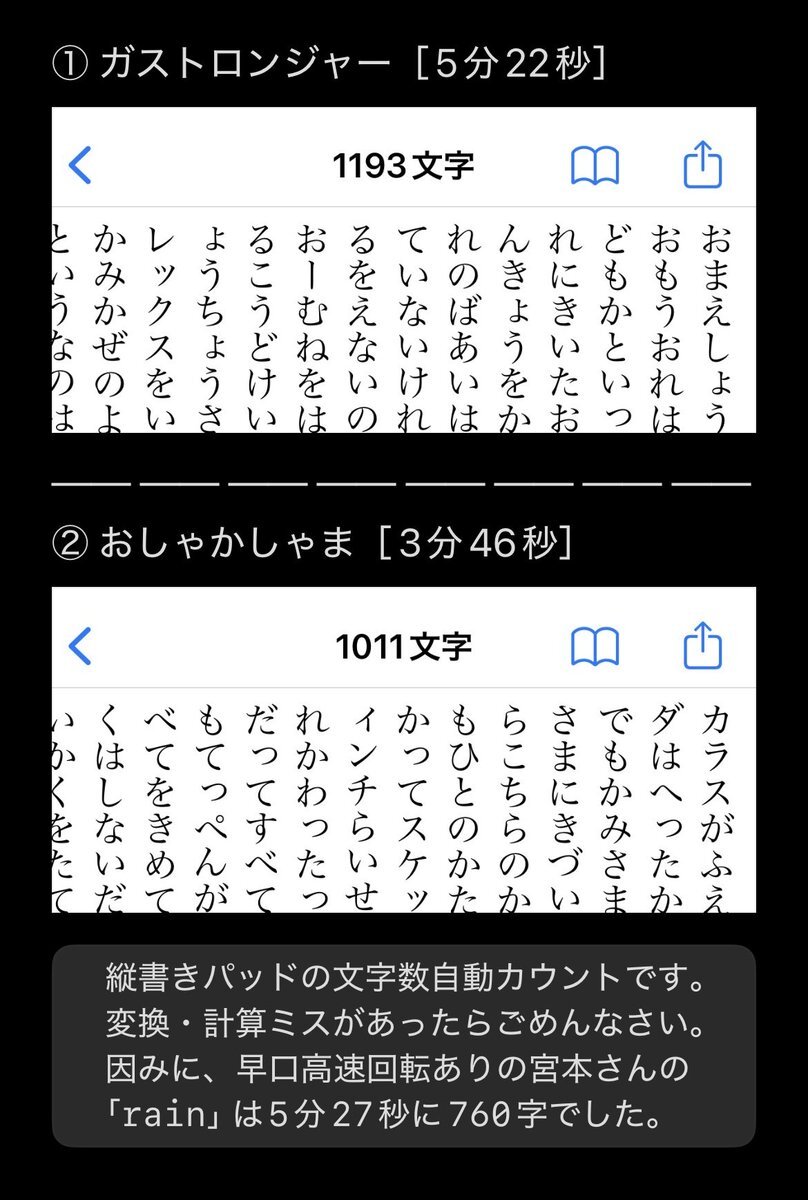ガーッと捲し立てガナり倒して歌う「ガストロンジャー」① 早口言葉の呪文を唱えるように歌う「おしゃかしゃま」② 歌詞をカナに変換して文字数を比較すると ① 1,193字/5分22秒 ② 1,011字/3分46秒 (時間は演奏のtotaltime) やはり「おしゃかしゃま」の言語密度は驚異的! #宮本浩次 #野田洋次郎 pic.x.com/bbDgp35pOc