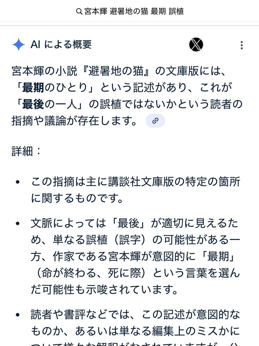 #宮本輝 『避暑地の猫』 #読了 誤植⁉️ 「最期のひとり」とある。場面的には「最後の一人」。 誤植の訳がない。ならば意図的に使われているはずだ。 作家宮本輝の遊び心で「ほら、この後がどうなるか想像してごらん。ヒントは置いたよ」ということなのか。 #誤植 #講談社文庫 pic.x.com/0D8FgQsMxp