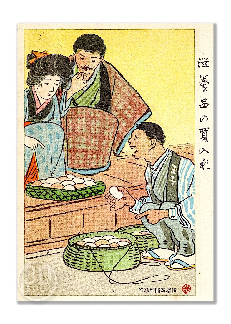 明治41年(1908) 滑稽新聞・絵葉書世界より「滋養品の買入れ」 若い夫婦が栄養豊富で滋養強壮に良いたまごを吟味中! #いいたまごの日 # #玉子 #滑稽新聞 #絵葉書世界 #宮武外骨 #イラスト #絵葉書 pic.x.com/AVYPQu2SbJ