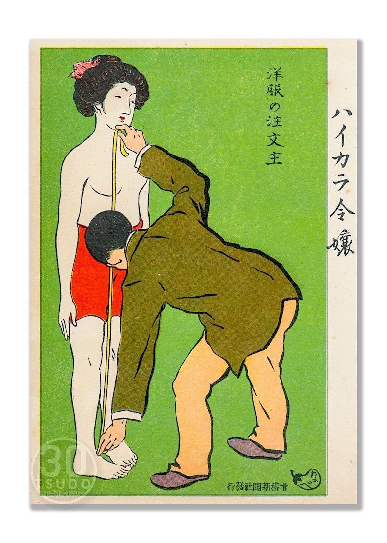 明治41年(1908) 滑稽新聞・絵葉書世界より「ハイカラ令嬢」 採寸をして、生地を選んで.....洋服が仕立て上がるまでまだまだ時間が掛ります! #洋服記念日 #ハイカラ #滑稽新聞 #絵葉書世界 #宮武外骨 #イラスト #絵葉書 pic.x.com/nAwVvc9Ff3