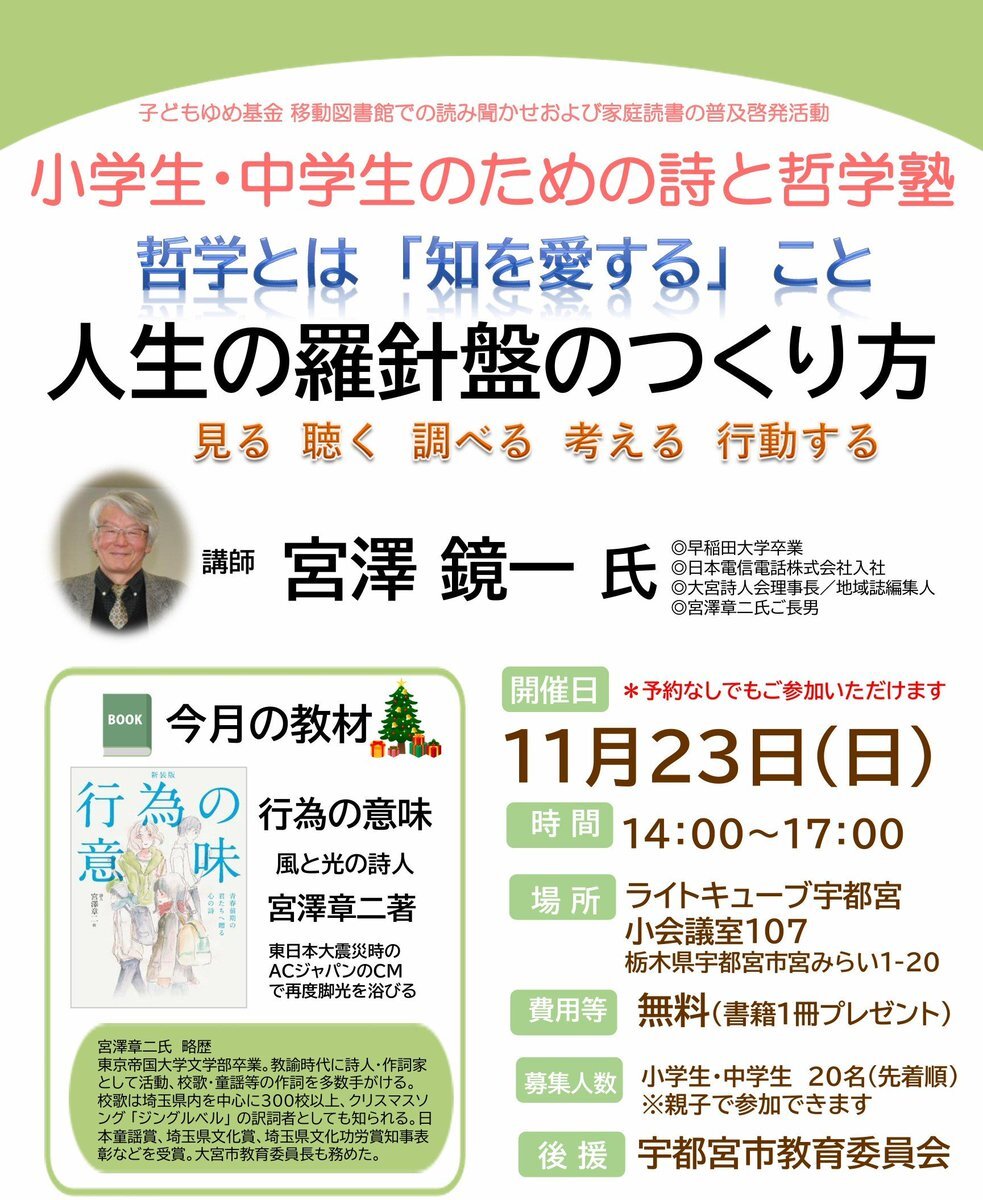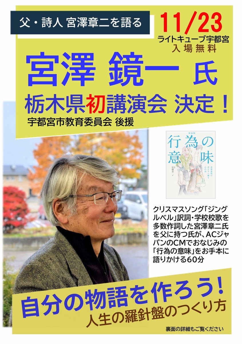 クリスマスソング「ジングル・ベル」の訳詞や多数の学校校歌の作詞で知られる宮澤章二氏の著書を長男・鏡一氏が語る60分。小・中学生の外、保護者・学校関係者もご参加いただけます。 #宮澤章二 #宮澤鏡一 #宇都宮市教育委員会 #ジングルベル #行為の意味 #ACジャパン #ライトキューブ宇都宮 pic.x.com/T02Rhqw7MG