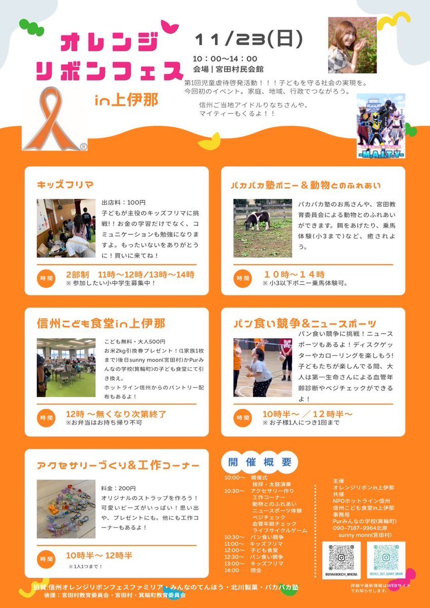 11/23(日) 宮田村民会館にて10:00〜14:00 オレンジリボンフェス🎗️を行います🥳 りなちも参加させていただきますので お気軽にお越しください💜 お待ちしてます♪ #オレンジリボン #宮田村 #信州ご当地アイドル #りなち pic.x.com/4BbXjXILu2