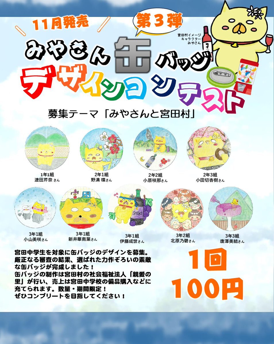 【11/17(月)販売開始】 第3弾となる「みやさん缶バッジデザインコンテスト」の入選作品を数量限定で販売開始します🎉 ■販売場所 宮田村役場、宮田村民会館(各施設の開庁時間中のみ) ■料金 1回100円 詳細は村公式サイトをご覧ください↓ vill.miyada.nagano.jp/topics/5059 #宮田村 #上伊那 #みやさん pic.x.com/pxVS7bhaOx