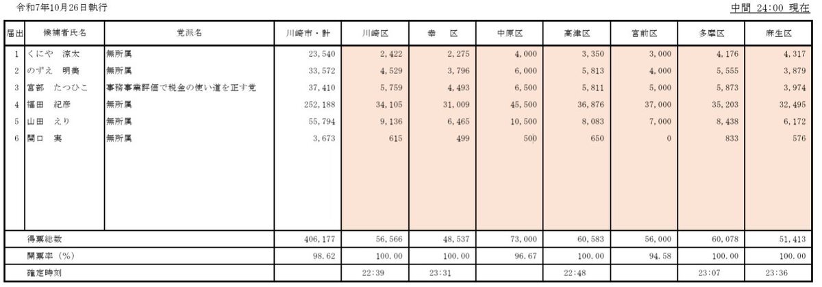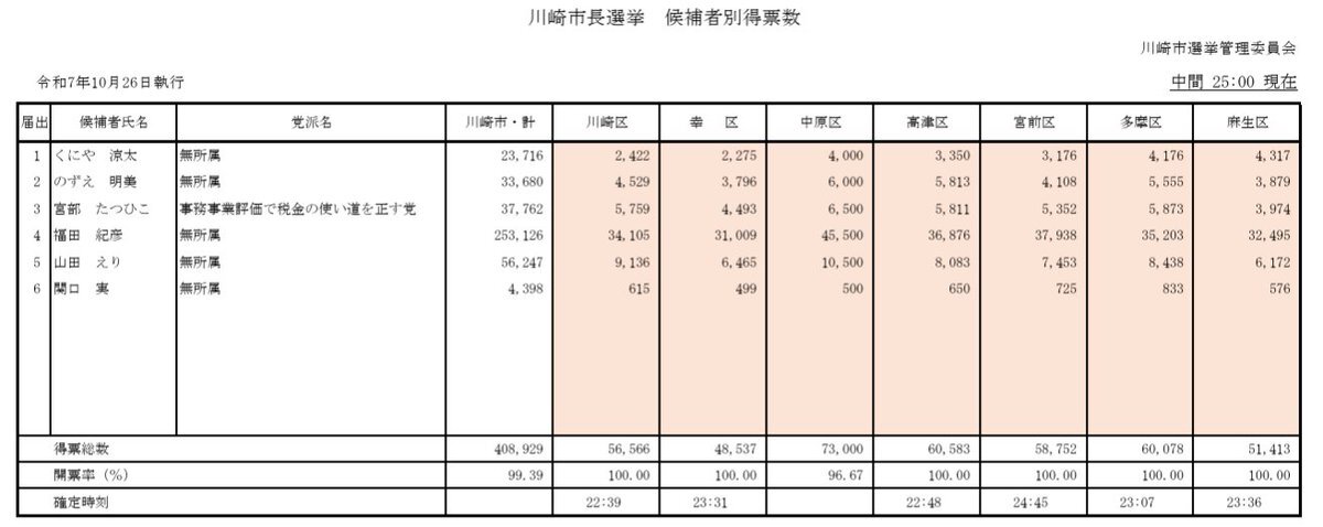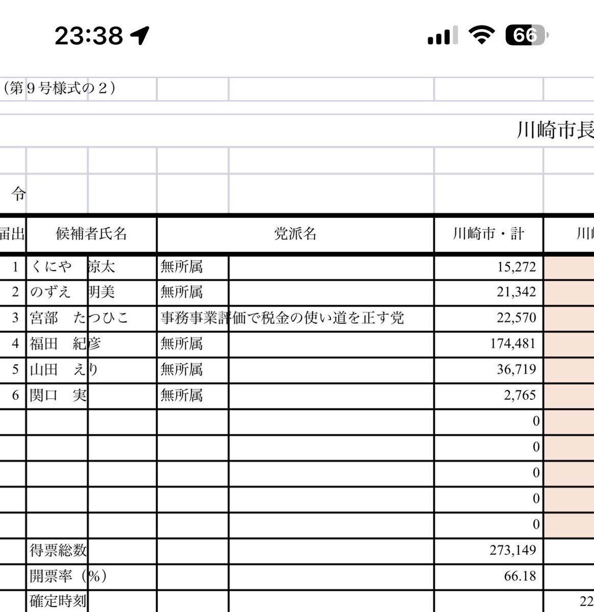 川崎市長選23:30速報らしいが、現職に勝つには大分票が足りてないな。 #川崎市長選挙2025 くにや 涼太 19,948 のずえ 明美 27,897 宮部 たつひこ 30,443 福田 紀彦 221,184 山田 えり 51,157 関口 実 3,098 senkyo.city.kawasaki.jp/06sokuhou.htm