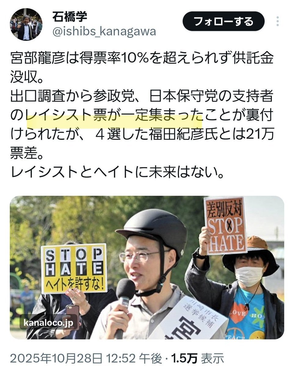 #川崎市 に、#宮部たつひこ に投票したバカが3万人もいることに愕然とするな #川崎市長選挙2025 x.com/I_TOR346/statu…