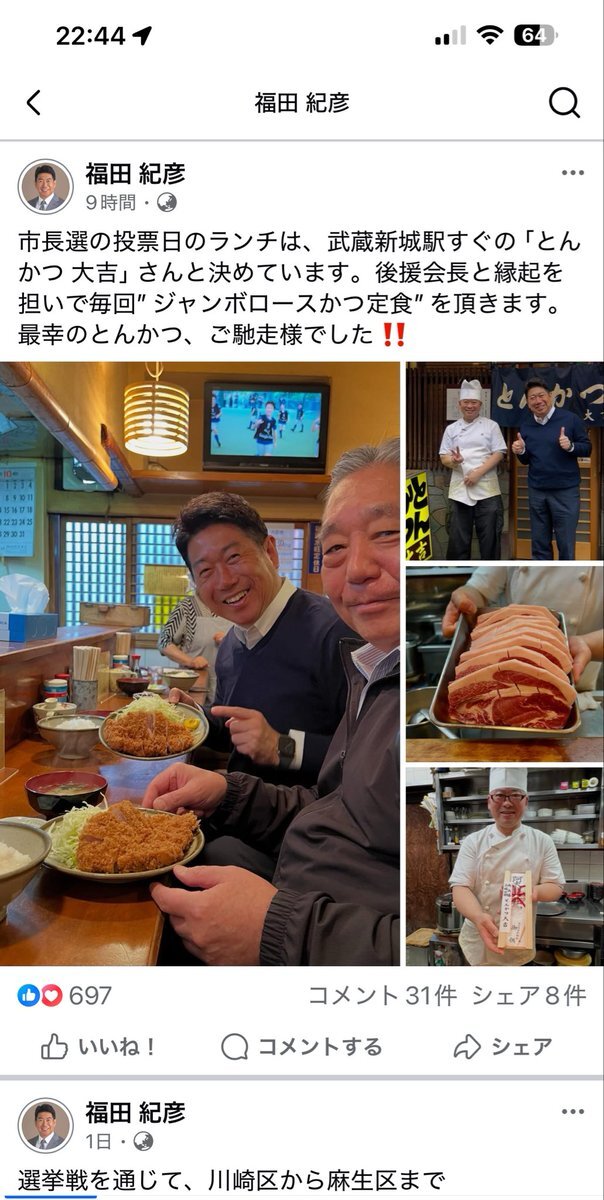 投票日当日22時時点で9時間前の投稿って公職選挙法違反では? フォローも見たこともないのにFacebookでこの投稿がおすすめ(?)で表示。氏のページで確認したけどやはり9時間前。蓮舫の時も結局うやむやで終わっている。果たして。 #川崎市長選挙 #宮部たつひこ さんをこれからも応援します #川崎市 pic.x.com/iFRXkVicWI