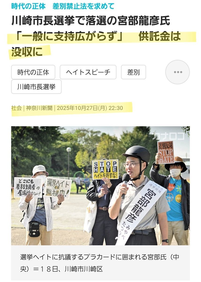 Yahooニュースにも。 #川崎市長選挙 #宮部たつひこ #宮部龍彦 川崎市長選挙に立候補の宮部龍彦氏、差別扇動最後まで 街頭演説に市民ら抗議(カナロコ by 神奈川新聞) #Yahooニュース news.yahoo.co.jp/articles/53424…