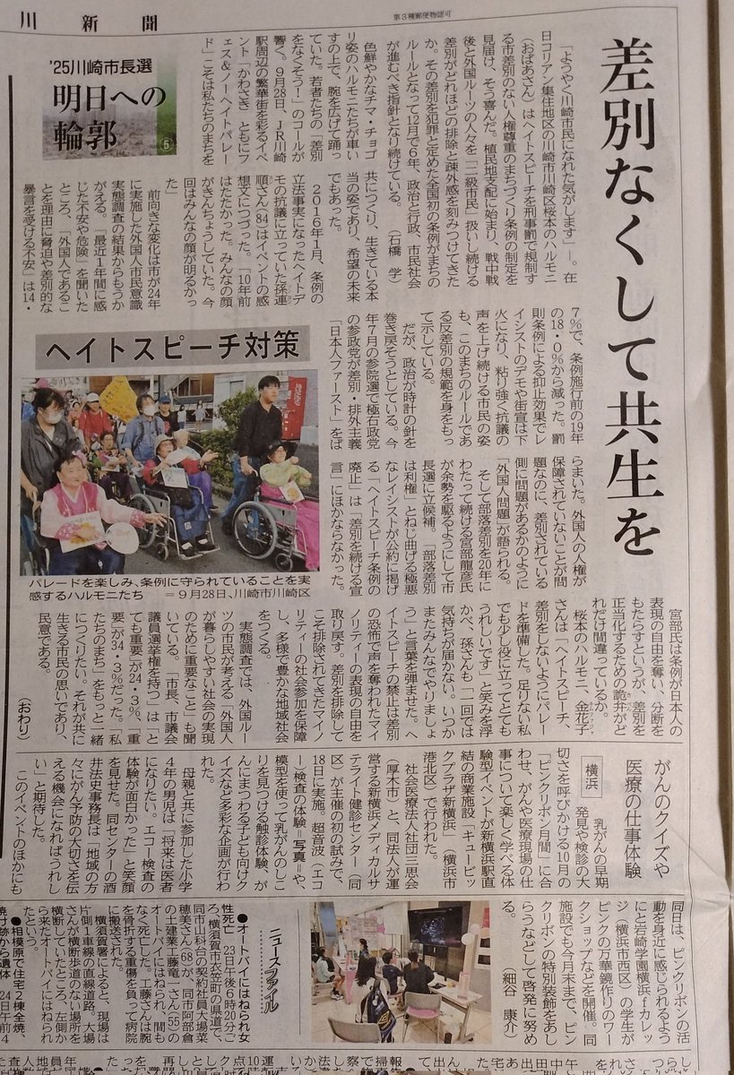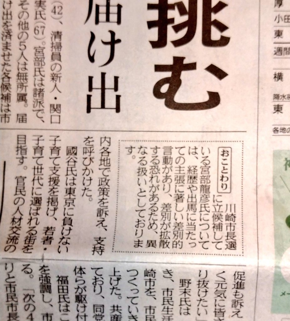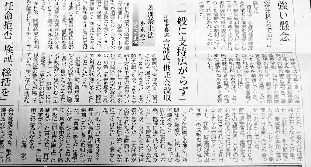 2025.10.19 「卑劣な差別扇動に批判」「まっとうな政治を」 レイシスト候補に圧倒的最下位落選と供託金没収を #宮部龍彦に投票してはいけない #川崎市長選挙 🗞️神奈川新聞は駅コンビニ、図書館で。買って読んで応援📢 pic.x.com/BdNVj5lKkM