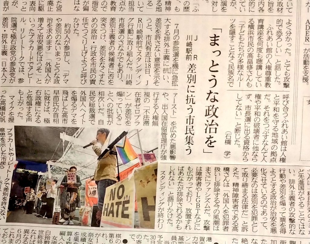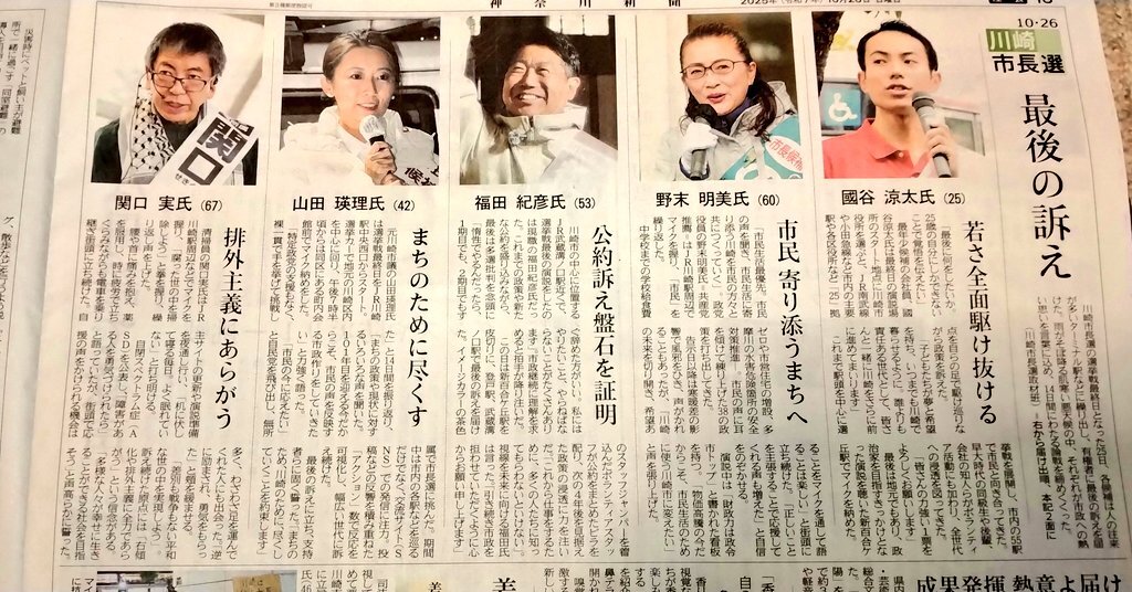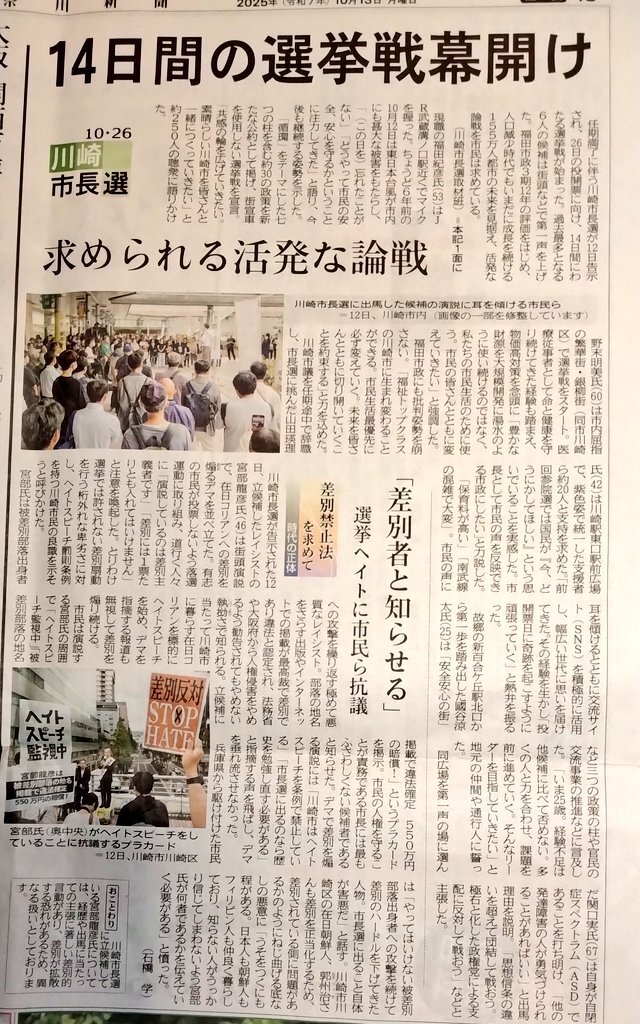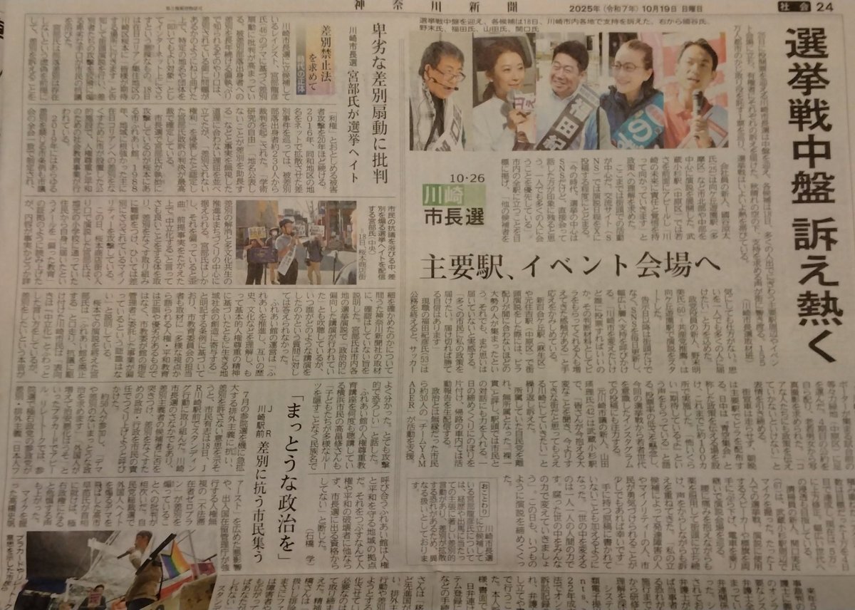 2025.10.25 川崎市長選最終日 【明日への輪郭】差別なくして共生を 【高市政権考】多様性逆行 【差別禁止法を求めて】犬笛投稿違法性認定 レイシスト候補に圧倒的最下位落選と供託金没収を #宮部龍彦に投票してはいけない #川崎市長選挙 🗞️神奈川新聞は駅コンビニ、図書館で。買って読んで応援📢 pic.x.com/cOljBvqDRe