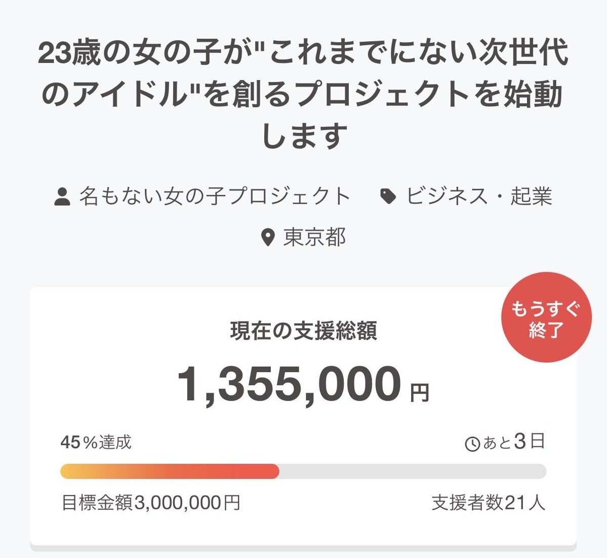 宮里莉羅アイドルプロジェクト クラウドファンディング🎀 camp-fire.jp/projects/88492… \ 🔥残り3日🔥 / 達成率45% 支援総額1,355,000円 支援額100万円を超えました😭 有難うございます💫 残り少ない期間ですが、次世代を担うアイドルを創るため皆さんの力を貸して欲しいです🙇🏻♀️お願いします!