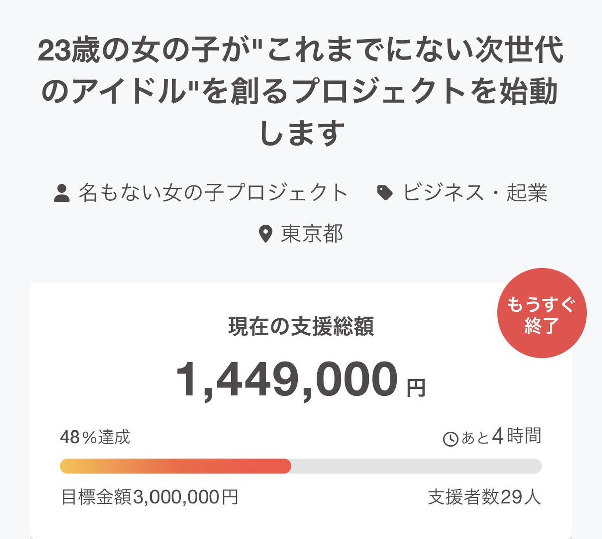 宮里莉羅アイドルプロジェクト クラウドファンディング🎀 camp-fire.jp/projects/88492… 🔥残り4時間🔥 達成率48% 支援総額1,449,000円 クラファンも本日までとなりました❕ ラストスパート応援よろしくお願いします🙇🏻♀️
