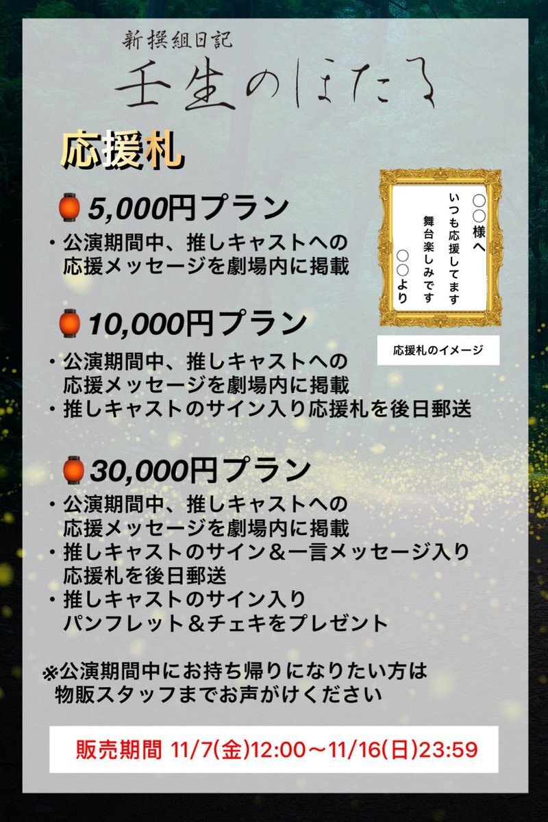 舞台 新撰組日記 「#壬生のほたる2025」 推しキャストに向けた 【応援札】及び【応援差し入れ】の 販売開始📣❣️✨ ▼販売サイト rakipro.base.shop 11/16(日)23:59まで ※詳細は画像をご確認ください ※お祝い花やプレゼントのお受け取りはできかねます、ご理解のほど宜しくお願い致します