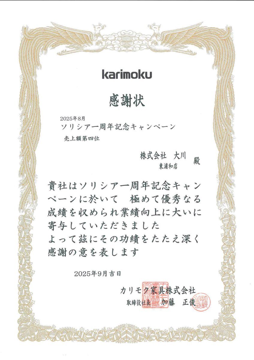 【サービス部】 弊社東浦和店がカリモク家具さんから感謝状をいただきました🎉 キャンペーン売上全国4位🪑 せっかくなのでPRに使わせていただきます😁 大川家具東浦和店 oh-kawa.co.jp/map/urawa #大川家具 #家具修理 #カリモク #カリモク家具 pic.x.com/NaiExey2LT