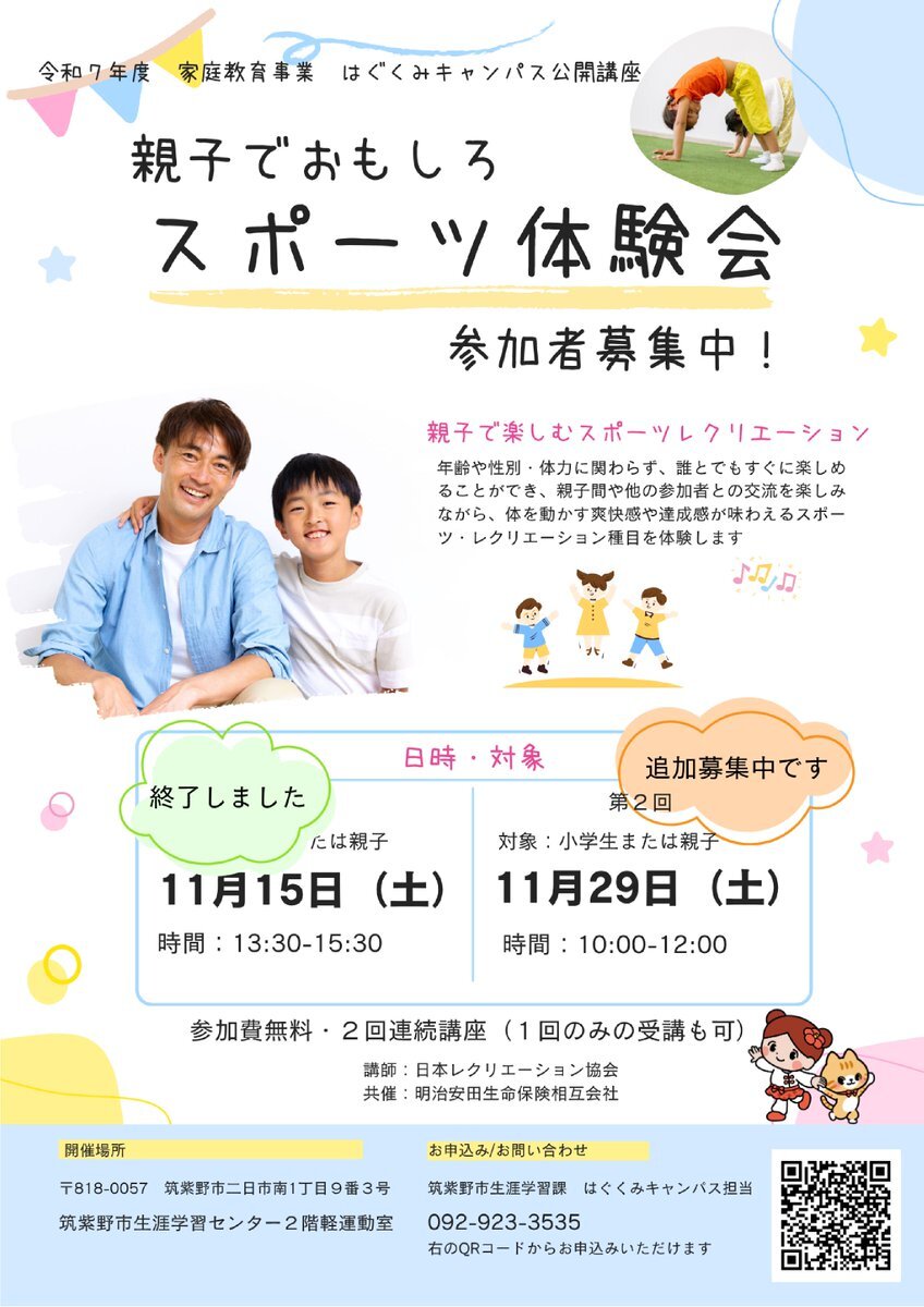 【公開講座「親子でおもしろスポーツ体験」】 誰でも楽しめるスポーツレクを親子で体験しよう! ○日時 11月29日(土曜日)10時から12時まで ○場所 筑紫野市生涯学習センター 託児あり。詳細は市ホームページをご覧ください。 city.chikushino.fukuoka.jp/site/shougaiga… #親子イベント #スポーツ体験 #家庭教育 #小学生 pic.x.com/sB2DNwtHwA