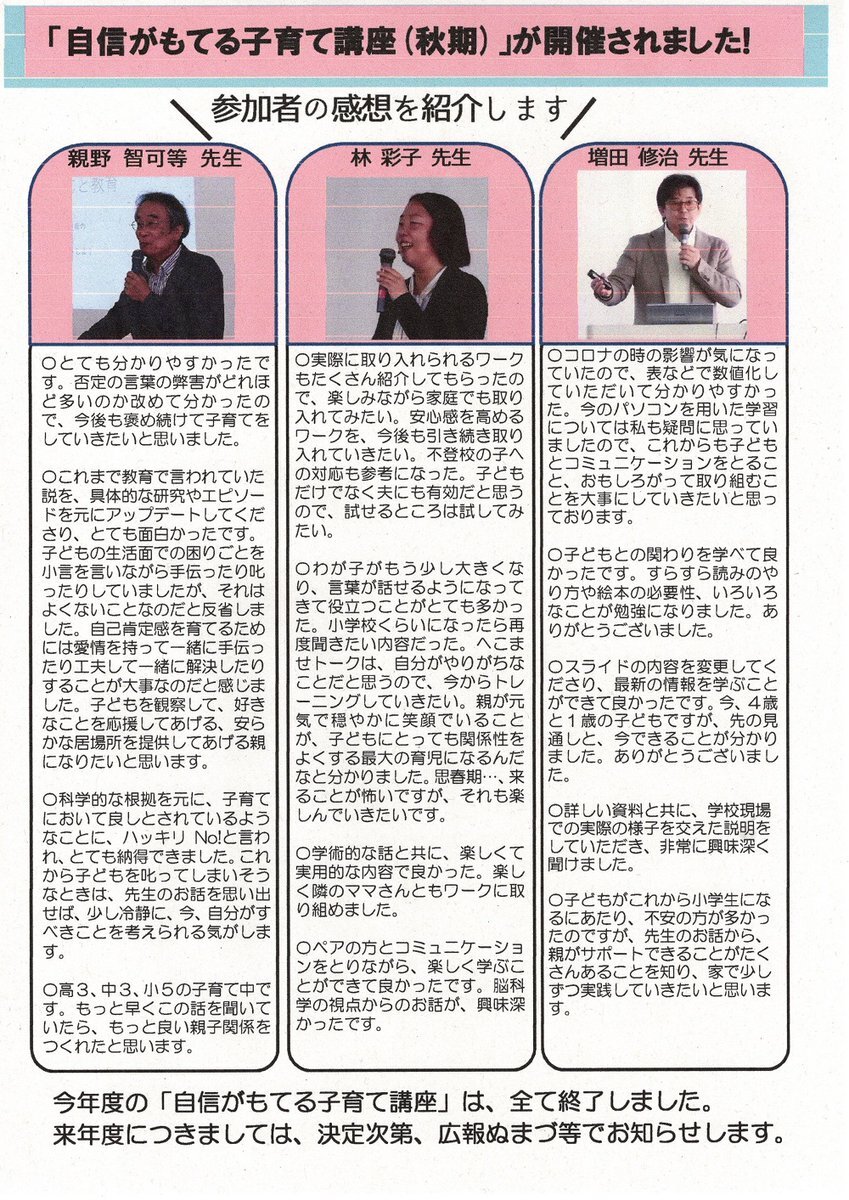 令和7年度 #自信がもてる子育て講座(秋期)が終了。 受講者からの感想を紹介します。 来年度については、決定次第、広報ぬまづ等でお知らせします。 #沼津市 #子育て #家庭教育 #子育て講座 pic.x.com/g9U1rhpsdv