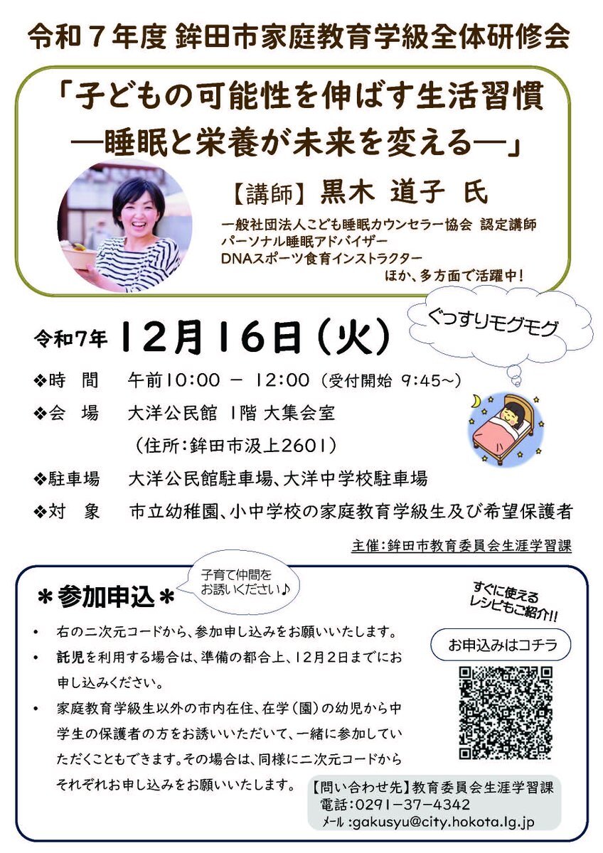 【#鉾田市 #家庭教育 学級全体研修会 参加者募集】 お子さんの睡眠と栄養について学びませんか?子どもたちの可能性を伸ばす睡眠と栄養のお話です。成長段階に応じたすぐに使えるレシピもご紹介! ●日時 12/16(火)10:00~12:00 ●会場 大洋公民館1階大集会室 ●詳細 city.hokota.lg.jp/page/page00065… pic.x.com/7kY7Sowgal