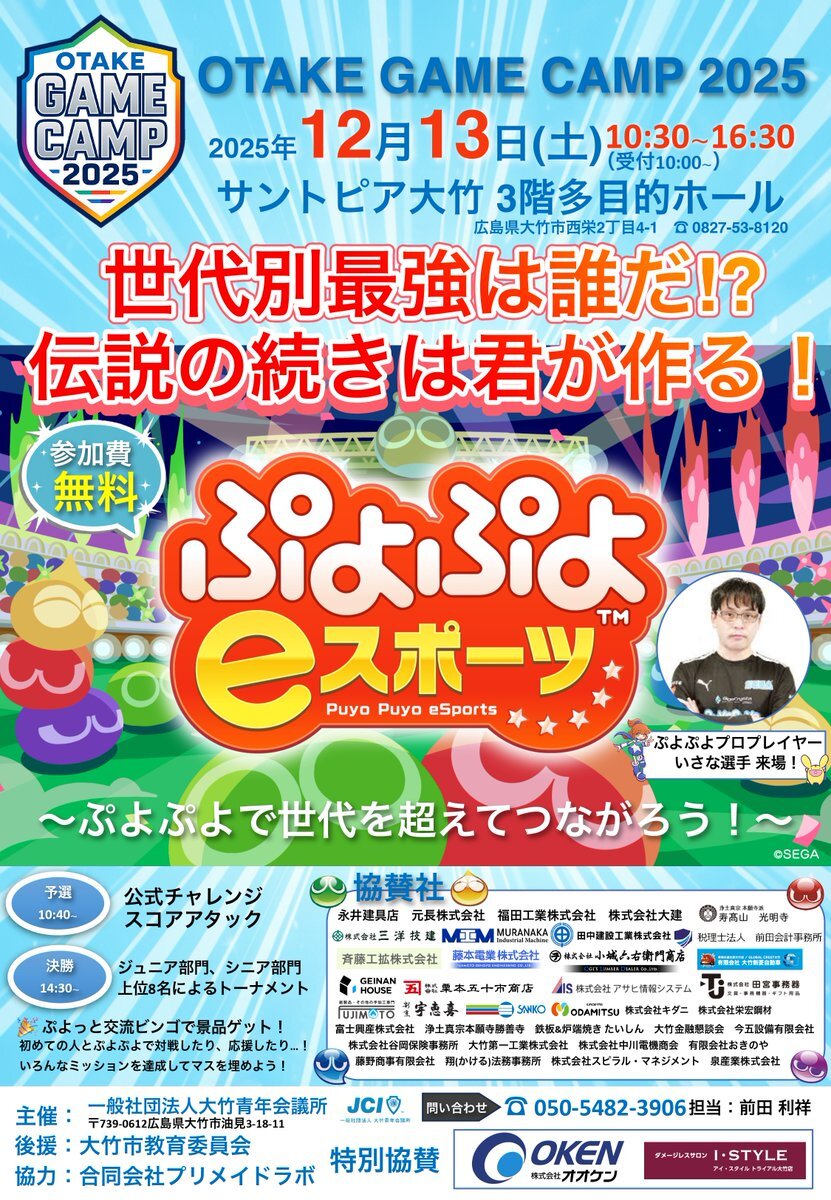 🎮 【参加者募集】OTAKE GAME CAMP 2025 🎮 広島県大竹市で『ぷよぷよeスポーツ』の交流イベントを開催します! 📅 12/13(土) 10:30~(開場10:00) 📍 サントピア大竹 💰 参加費無料・当日参加OK ▼詳細はこちら puyo-camp.jp/events/19396 #ぷよぷよキャンプ #ぷよぷよ #eスポーツ #大竹市