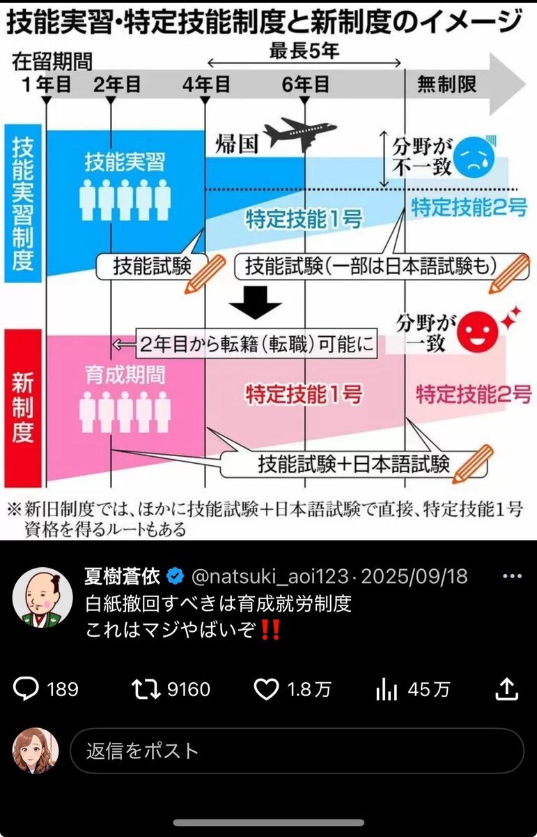 技能実習は 日本で技術を学んで、その学んだ技術を母国に持ち帰って母国を発展させようって制度 だから帰国する前提 なのに育成就労制度は 日本で技術を学んでそのまま働けるようにする制度なんよな あれ? 途上国の発展に貢献とかじゃなくなってる😳 #外国人育成就労制度反対 #家族帯同反対 x.com/midorin_dqw/st…