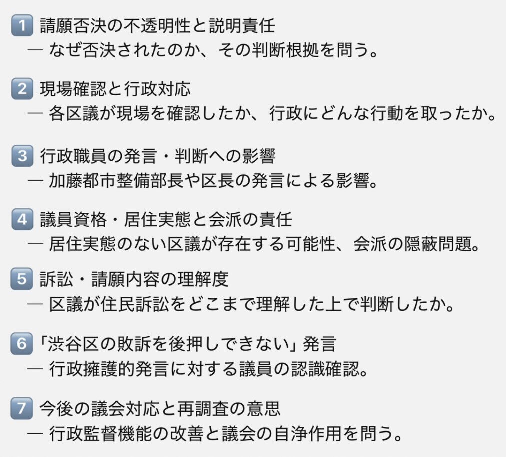 #富ヶ谷1丁目計画 公開質問項目 渋谷区全区議問います。 1️⃣ 請願否決の不透明性と説明責任 2️⃣ 現場確認と行政対応 3️⃣ 行政職員の発言・判断への影響 4️⃣ 議員資格・居住実態と会派の責任 5️⃣ 訴訟・請願内容の理解度 6️⃣ 「渋谷区の敗訴を後押しできない」発言 7️⃣ 今後の議会対応と再調査の意思 pic.x.com/XxaLkgImdx