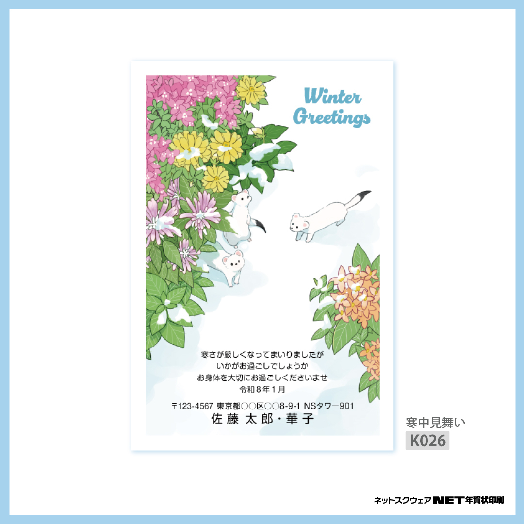 / おすすめデザインをピックアップ \ 寒中見舞い【K026】 真っ白なオコジョとカラフルな花が 可愛らしい雰囲気のデザインです❄️ 📢期間限定 印刷料金51%OFF! ▼ご注文はこちらから▼ nenga.print-netsquare.com #寒中見舞い #午年 pic.x.com/OLZQ26bQ6Q
