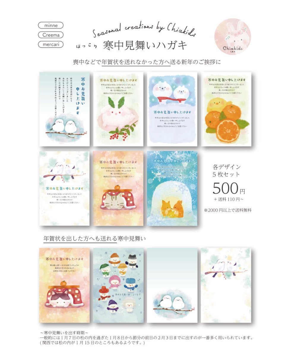 ハロウィンが終わると、もう年末年始がすぐそこ🎍 Chiakidsでは今年も《寒中見舞いはがき》販売中です❄️ 人気はシマエナガやしろくま、ねこ、ひよこなど🐧 「去年と違う柄で🎨」とリピートしてくださる方もたくさん…感謝です🥹💐 今年も、やさしい気持ちを届けるご挨拶にどうぞ💌 #寒中見舞い pic.x.com/yOS5ZReufA