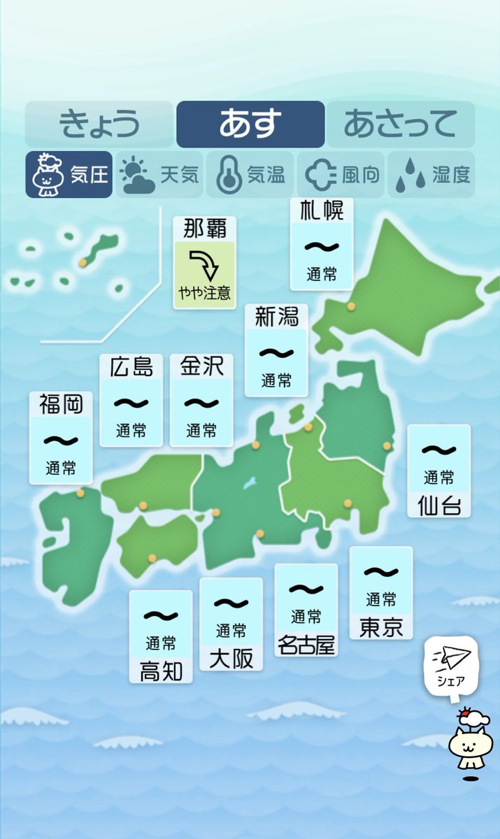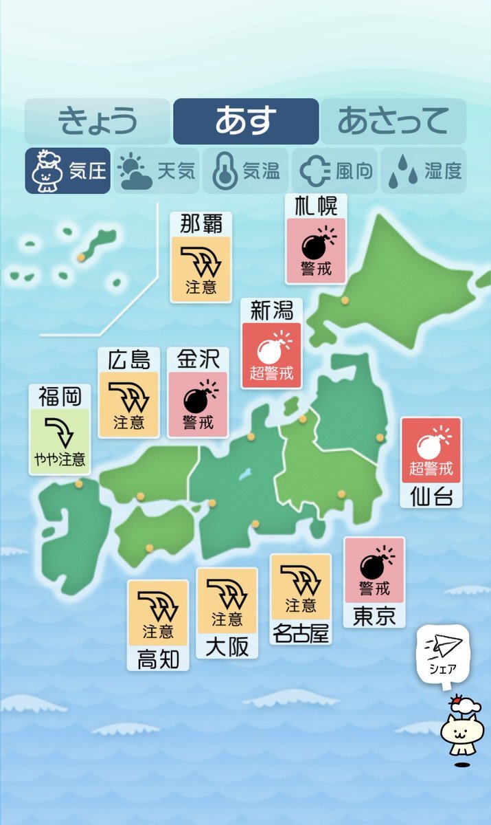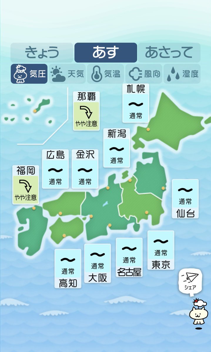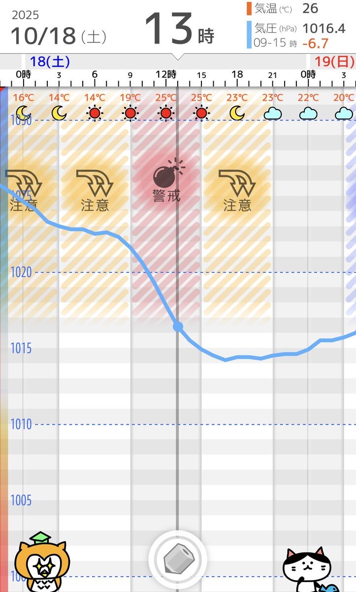 10/18(金)気象病予報 💥気圧低下に警戒 全国的に大きく気圧が低下します。西日本側から天候が崩れて雨予報の地域が多いでしょう。そして気温が再び上昇し30℃近くまで上がる地域が多く、蒸し暑さと寒暖差に注意が必要です。気圧低下と寒暖差で普段以上に体が重く感じるかもしれません。 #寒暖差疲労 pic.x.com/uUaK7KcaAH